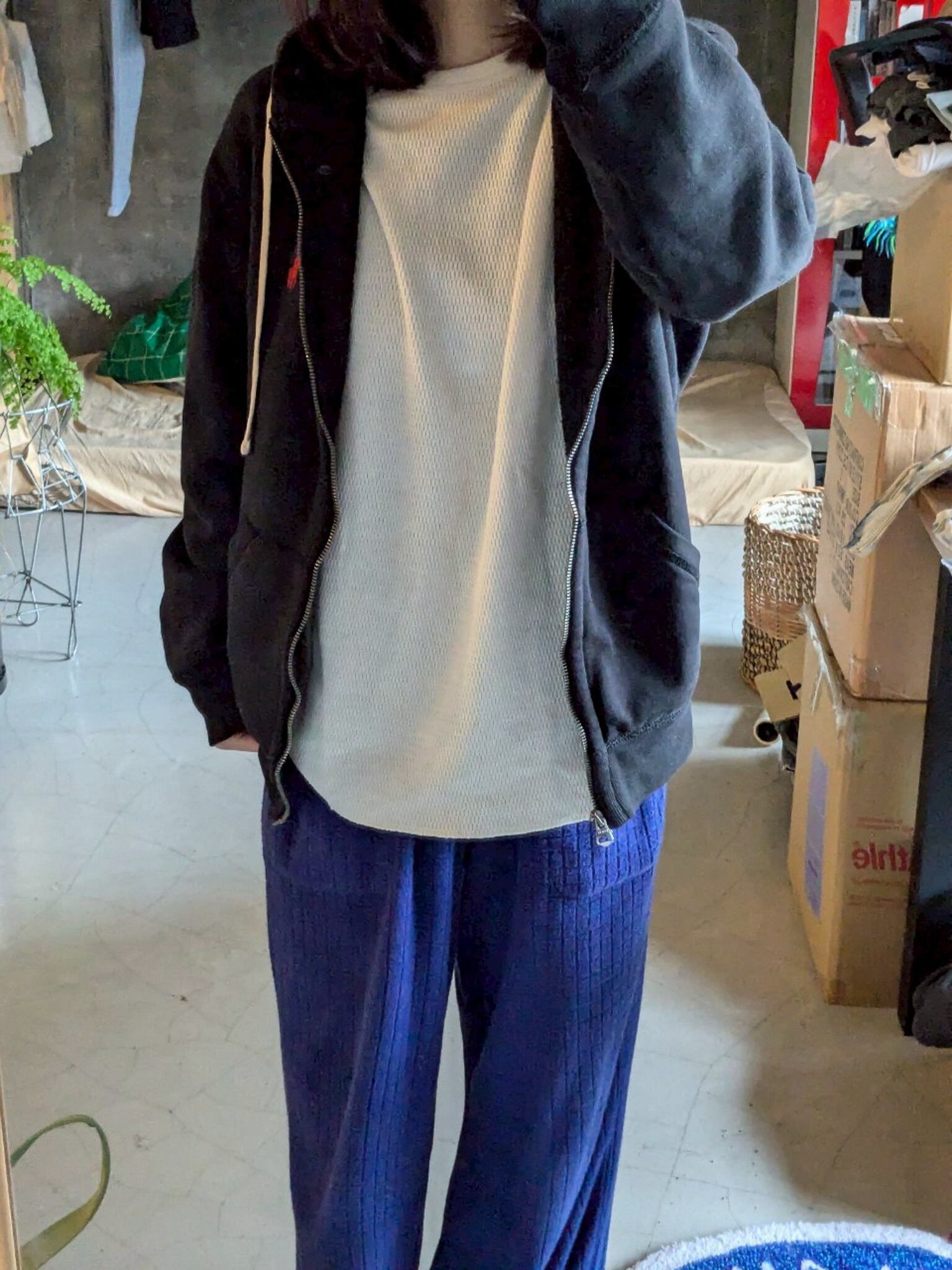 裏起毛なので1枚であたたかく、フードの裏がワッフルなので異素材感も楽しめます