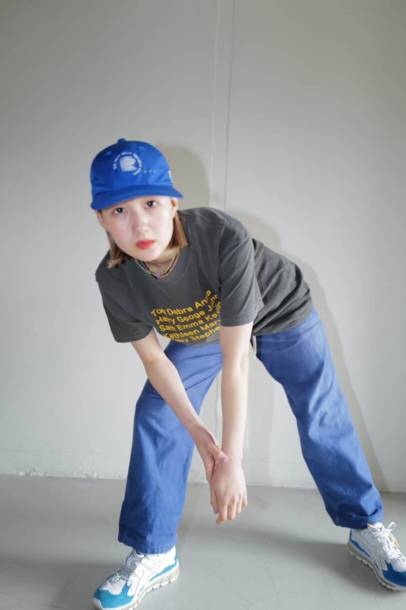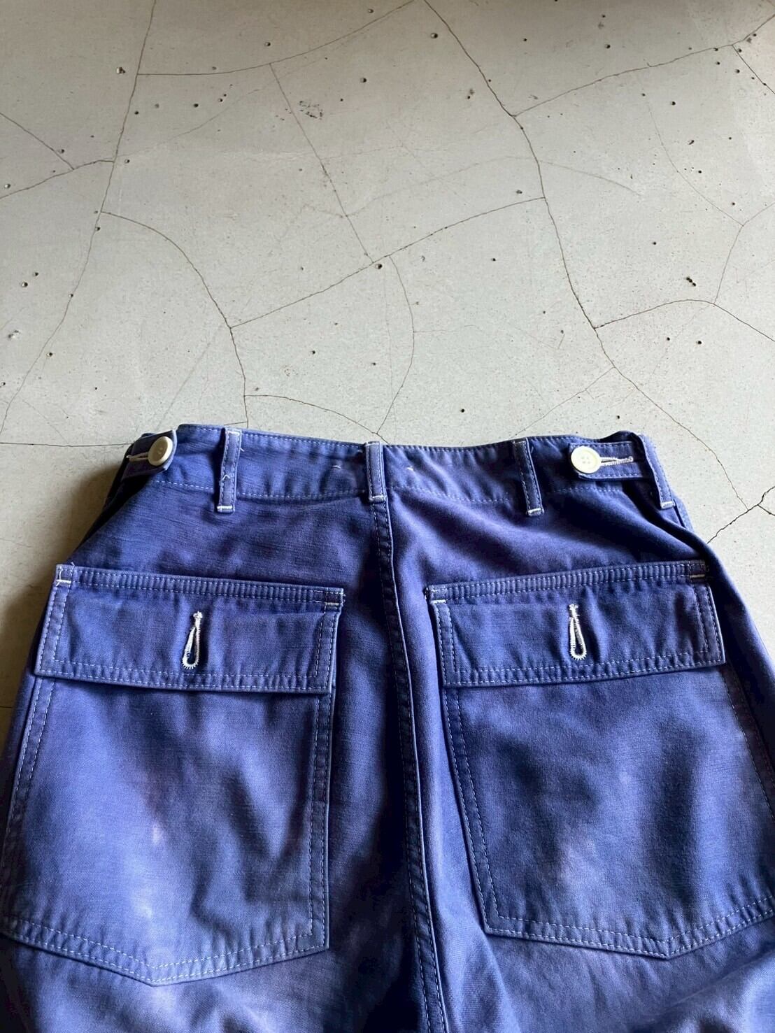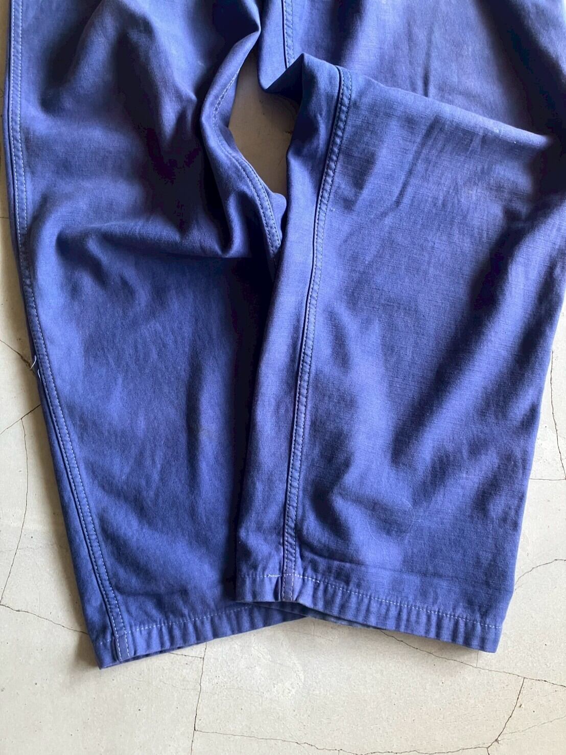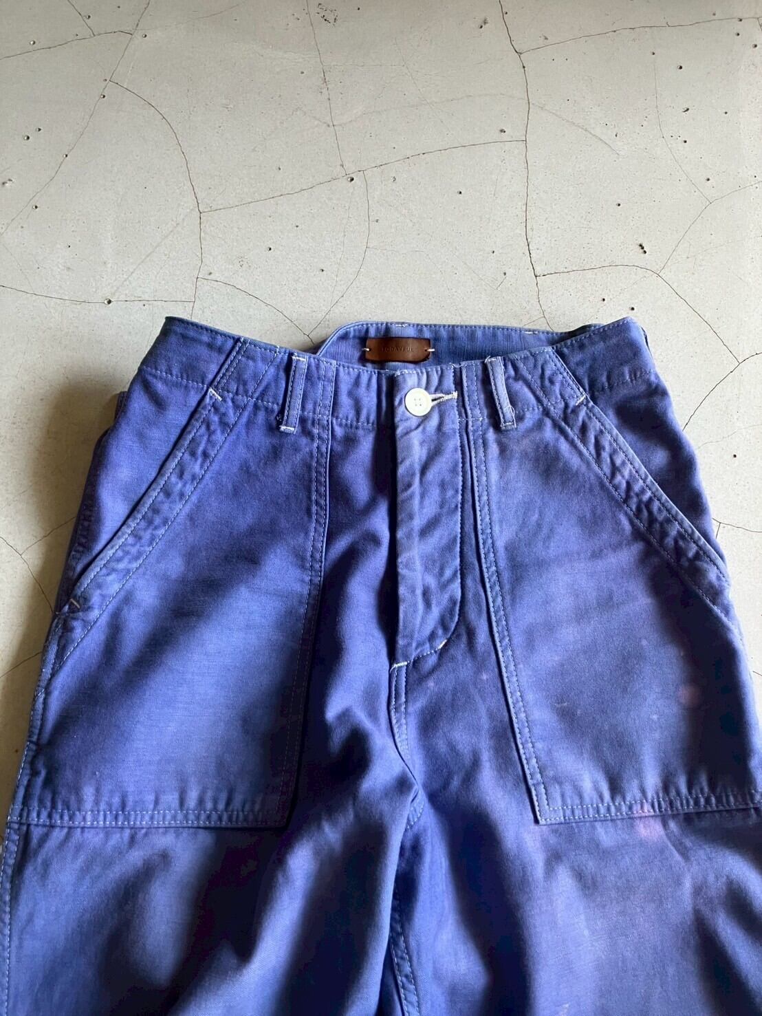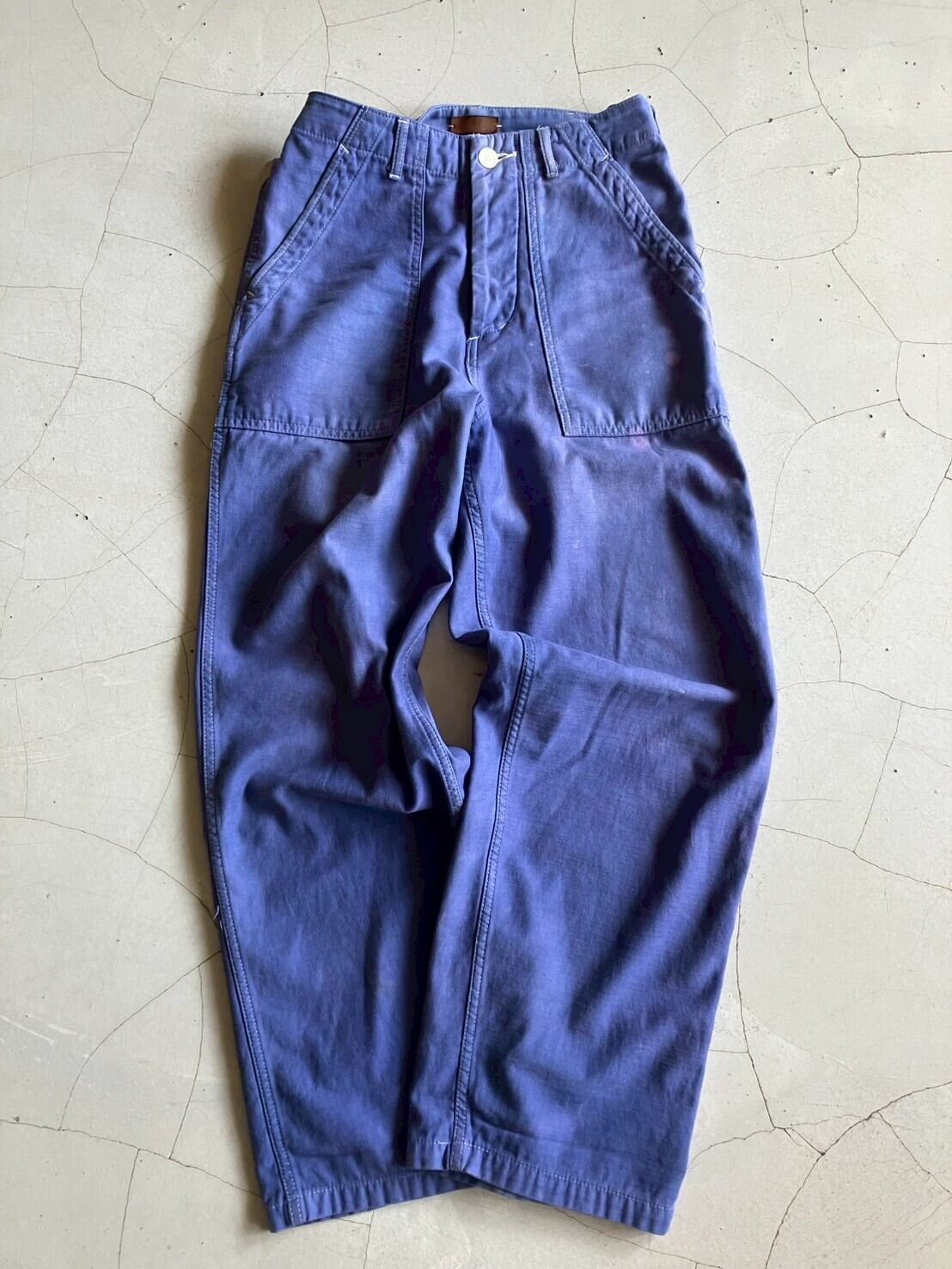 クタクタのホワイトのペインターパンツをブルーの染料で染めたもの