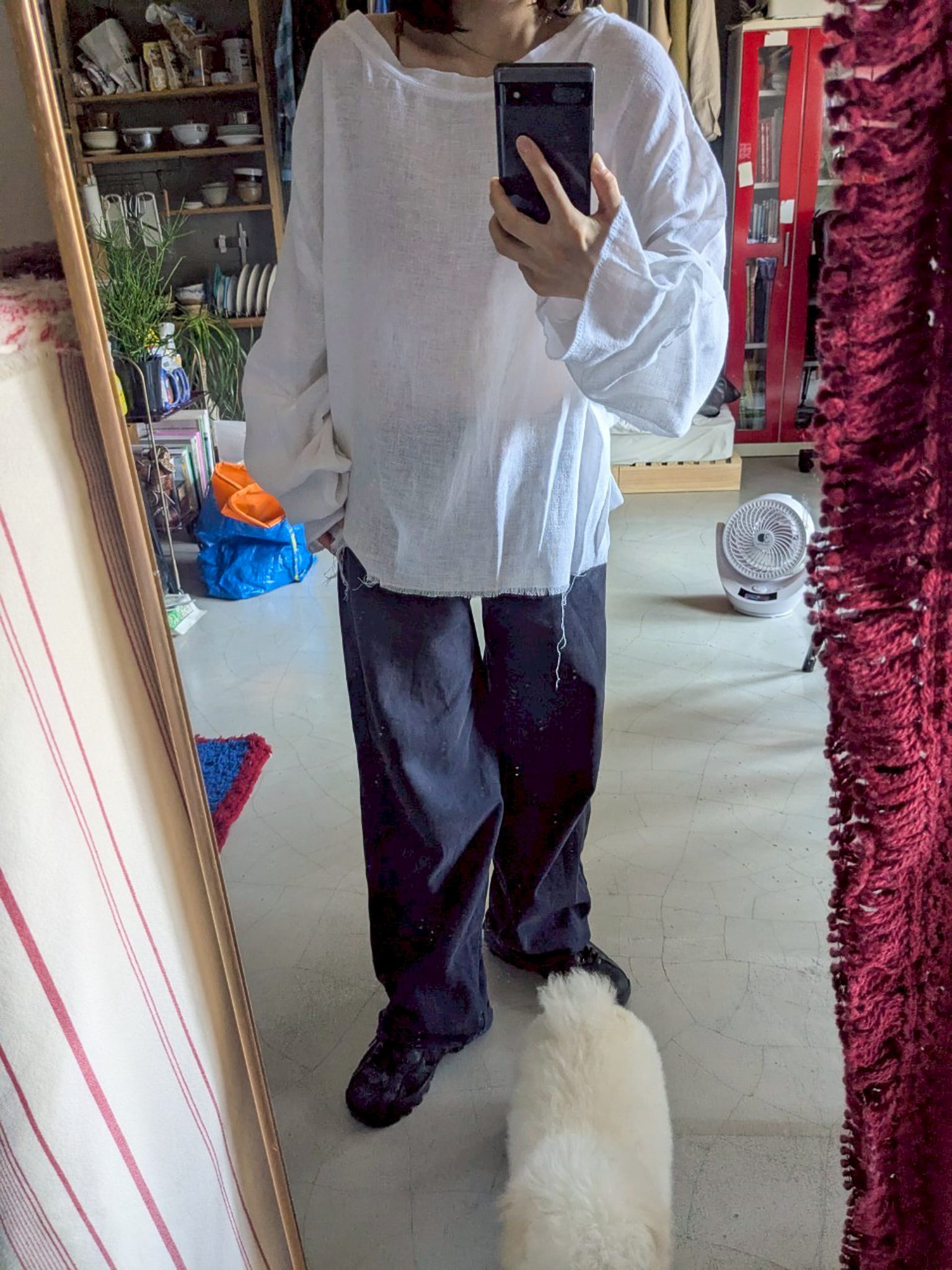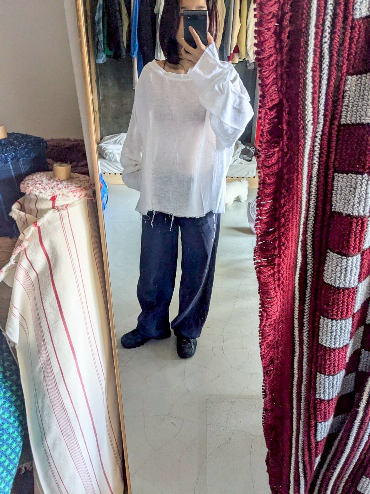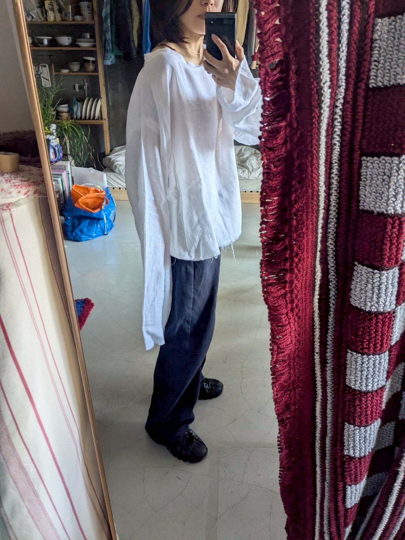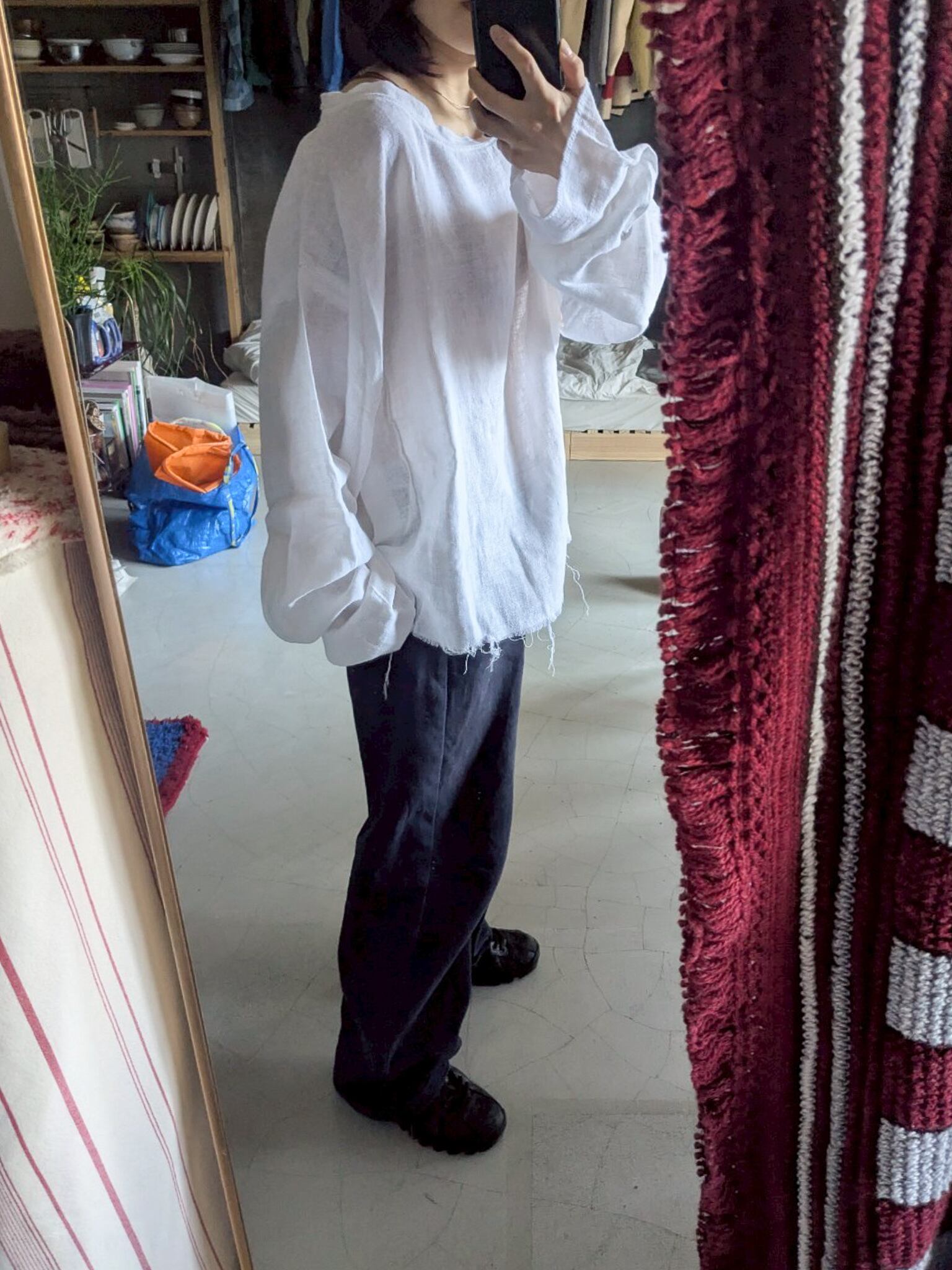 身幅はBIGシルエットに仕上げ、ネックも横に広く取り、ベーシックに着ても少しショルダー位置をずらしてワンショルダーとしても着て頂ける仕様になっています。