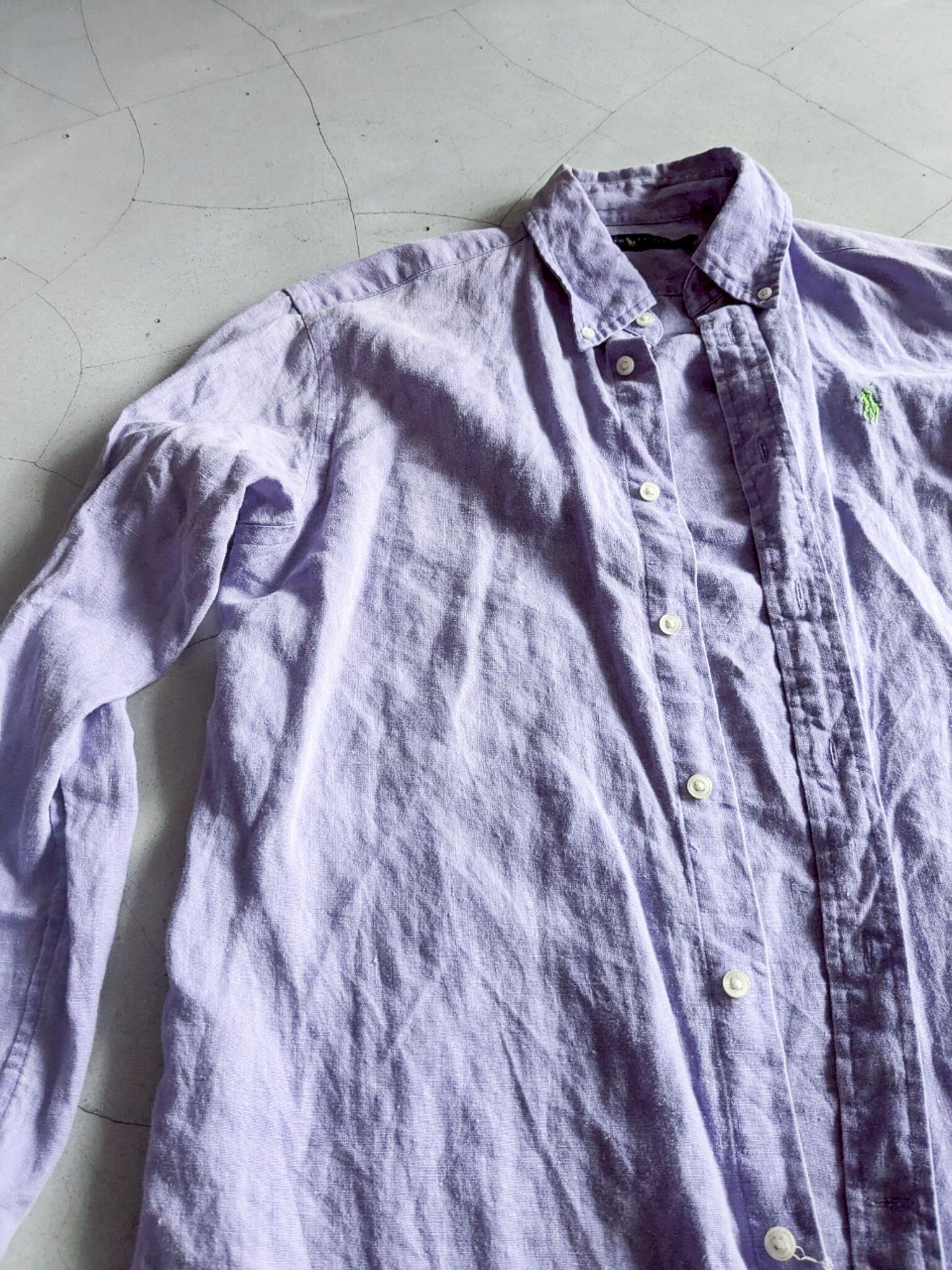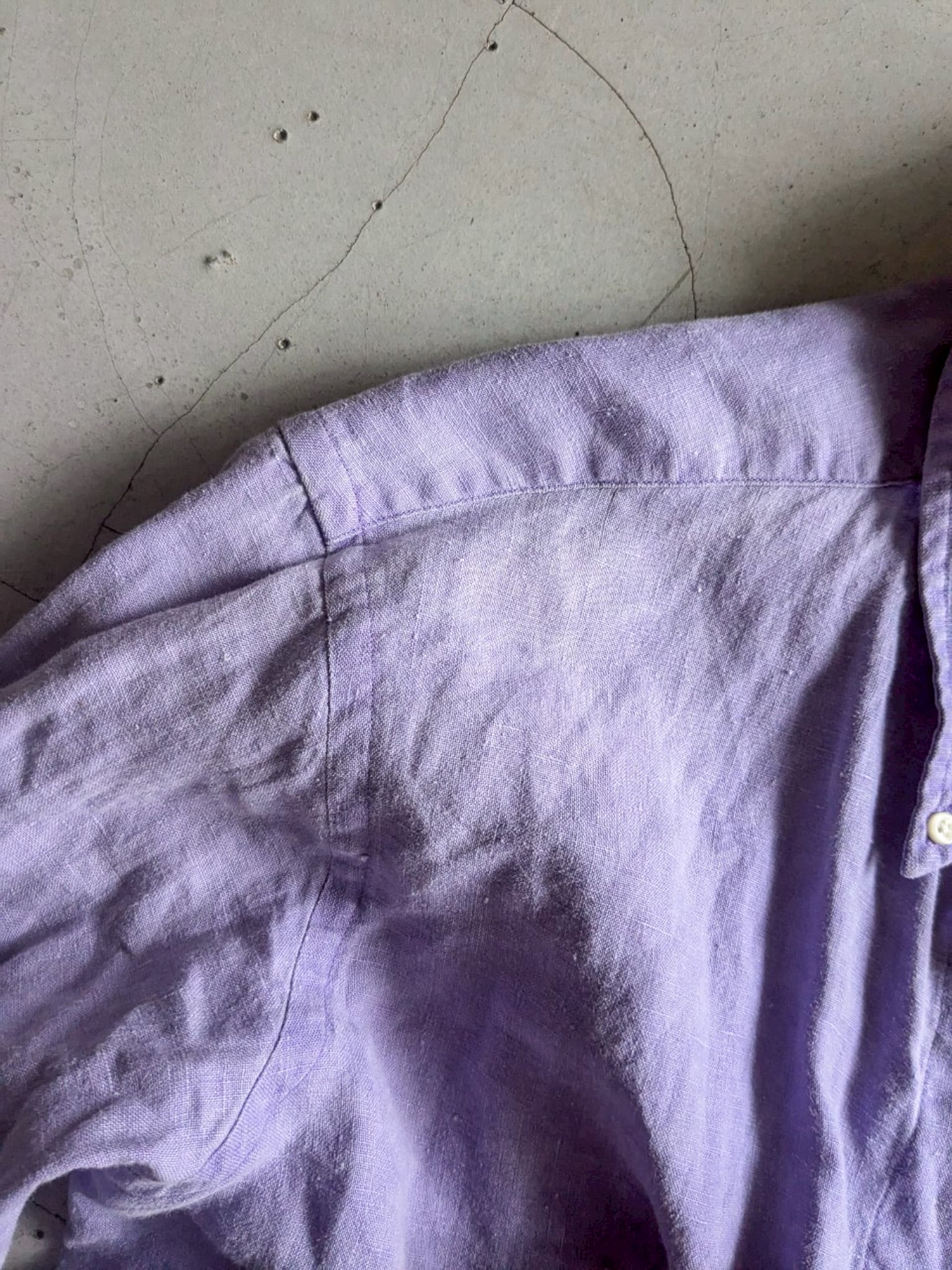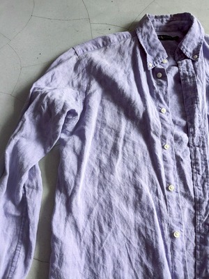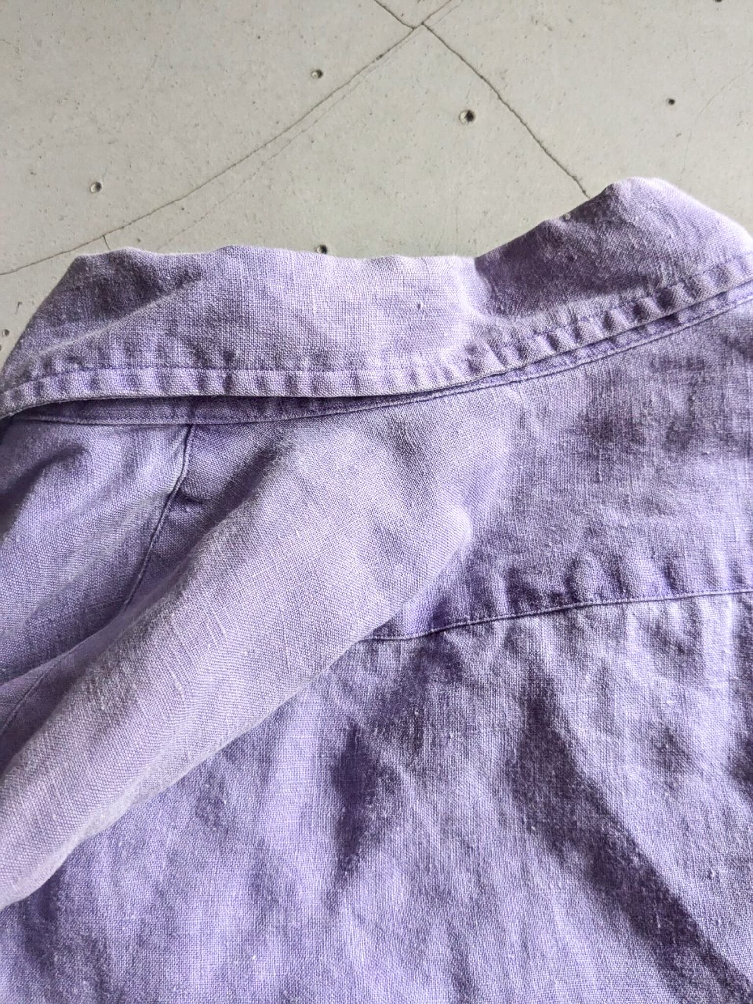 藤色のオーバーサイズリネンシャツ。
