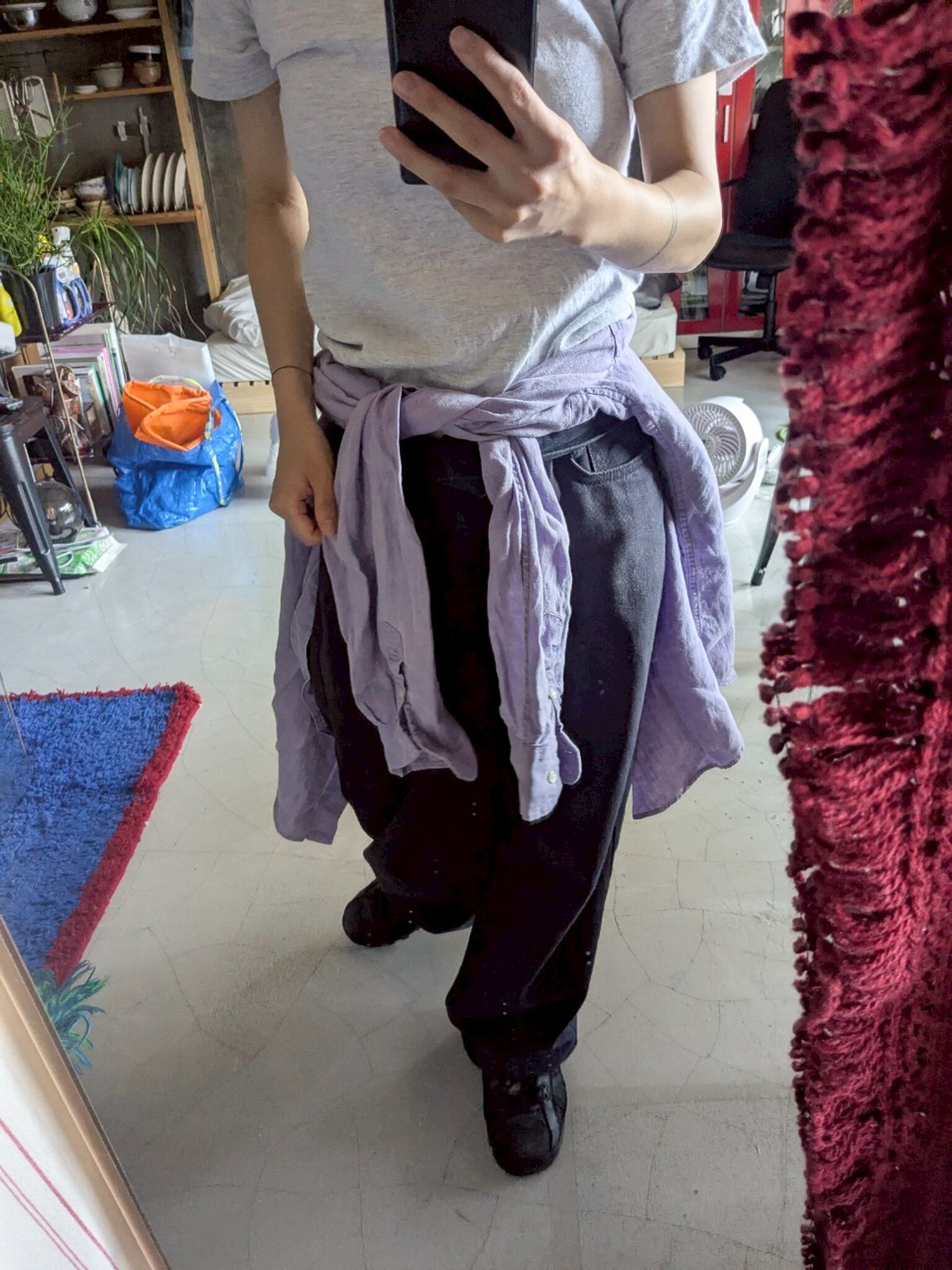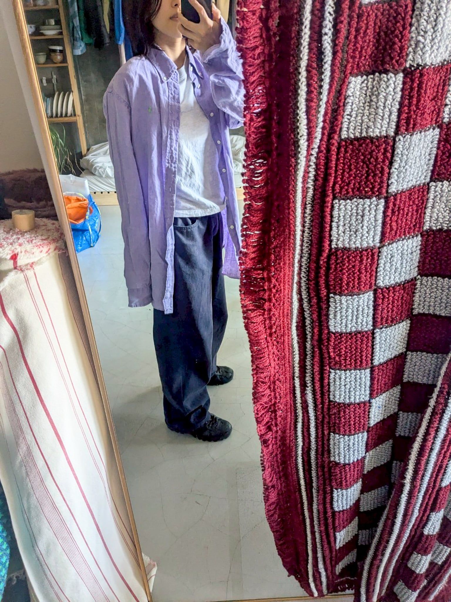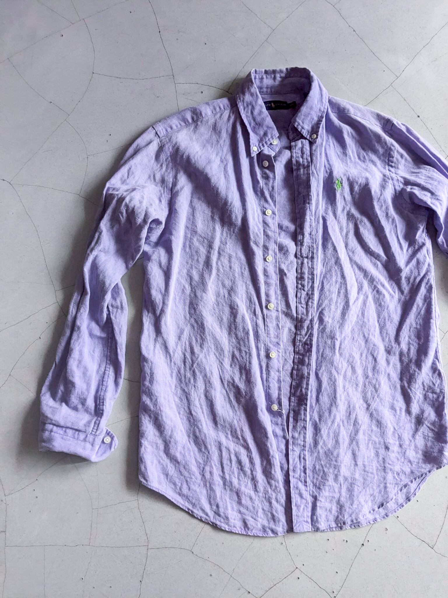藤色のオーバーサイズリネンシャツ。