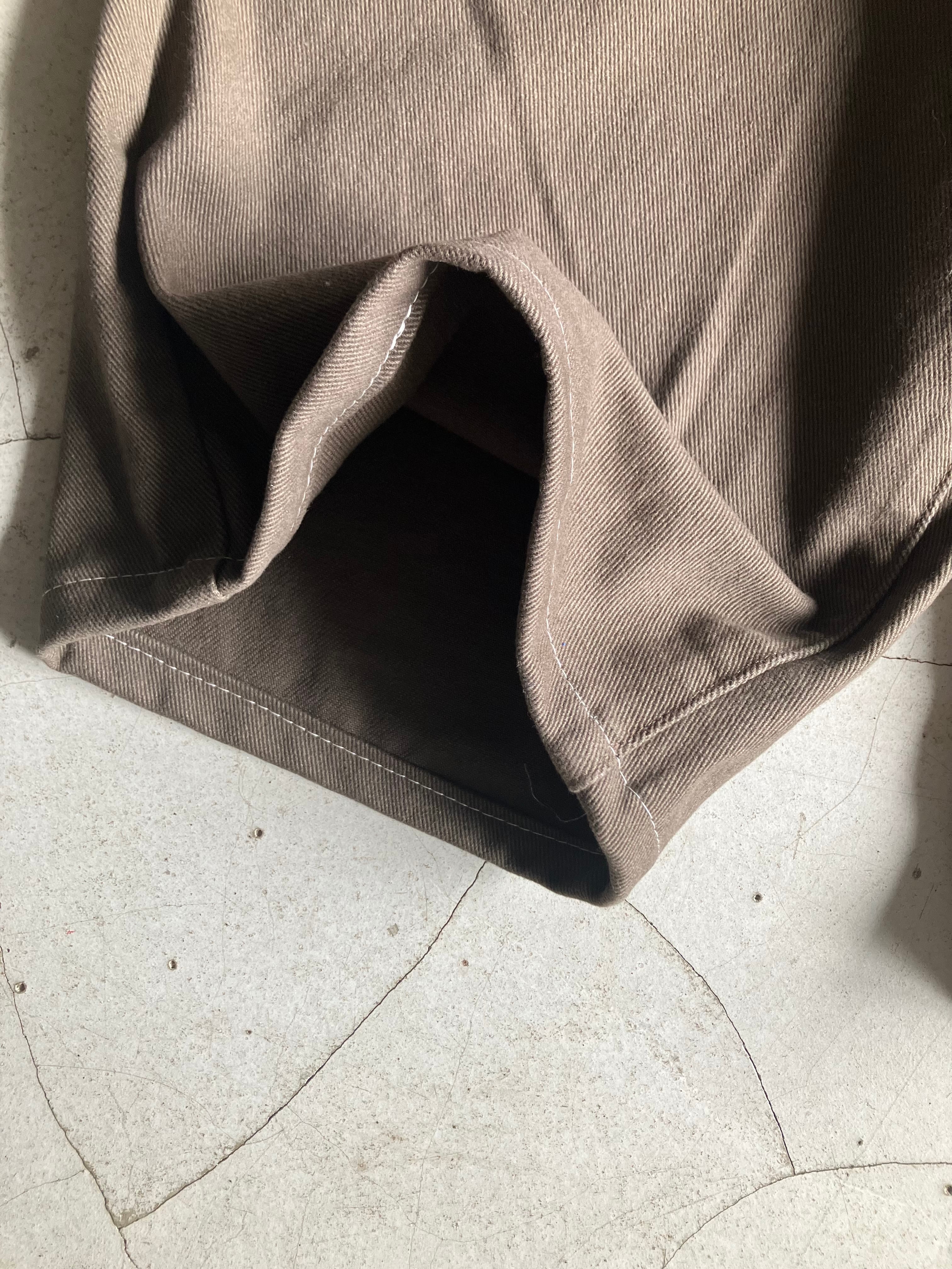 色褪せたブラウンパンツ デニムっぽいコットン素材です 裾を大幅にカットし、お直ししました。欲しかった丈感。是非サイドゴアブーツやソックスで遊んでみてほしい ウエスト31 股上30 股下35 ワタリ30 154cm