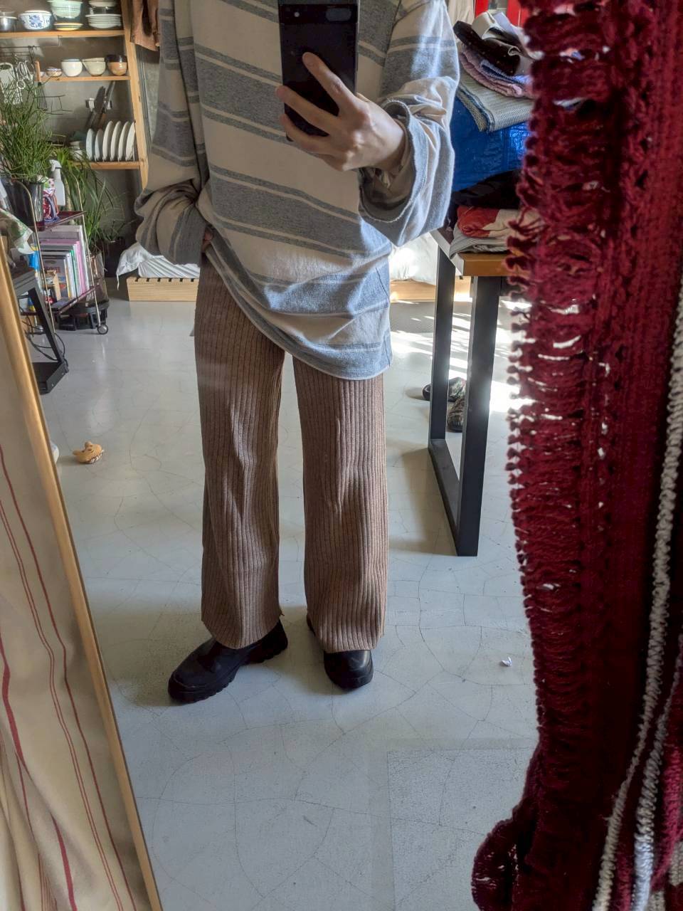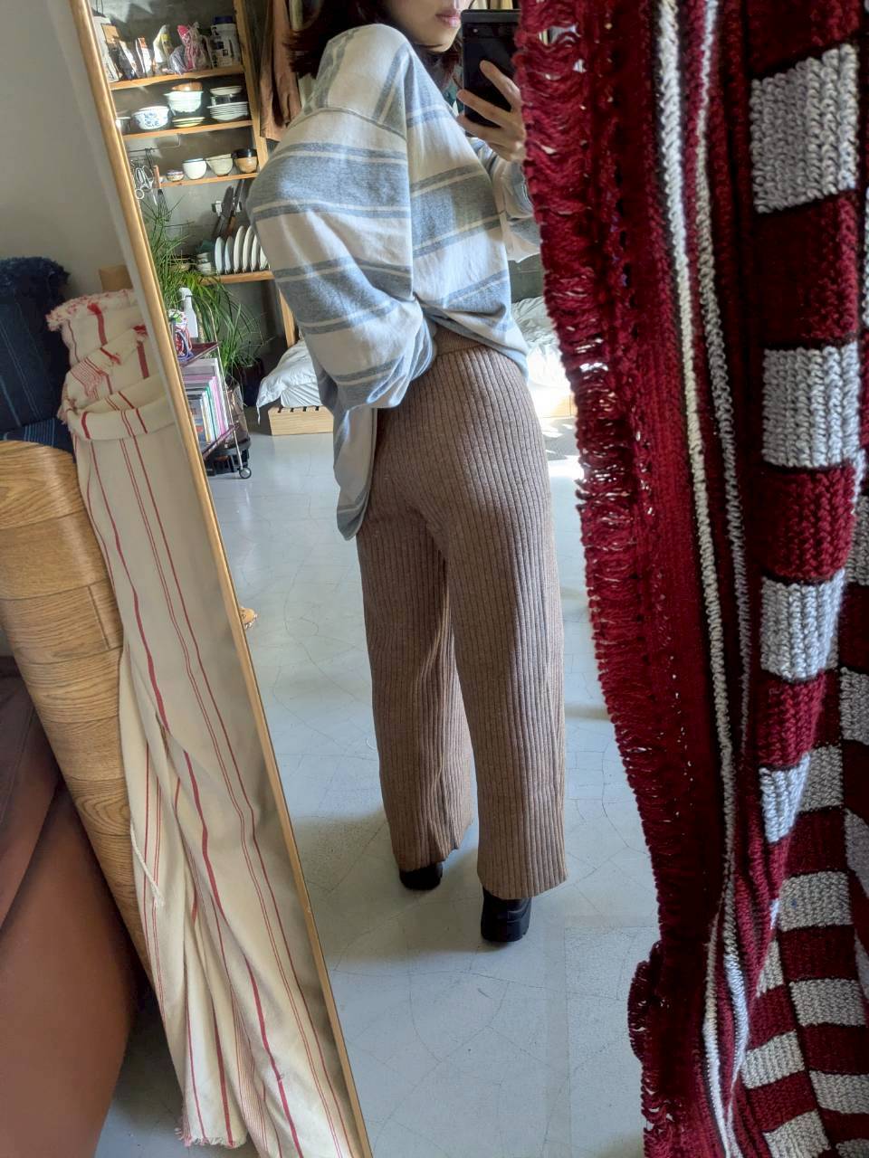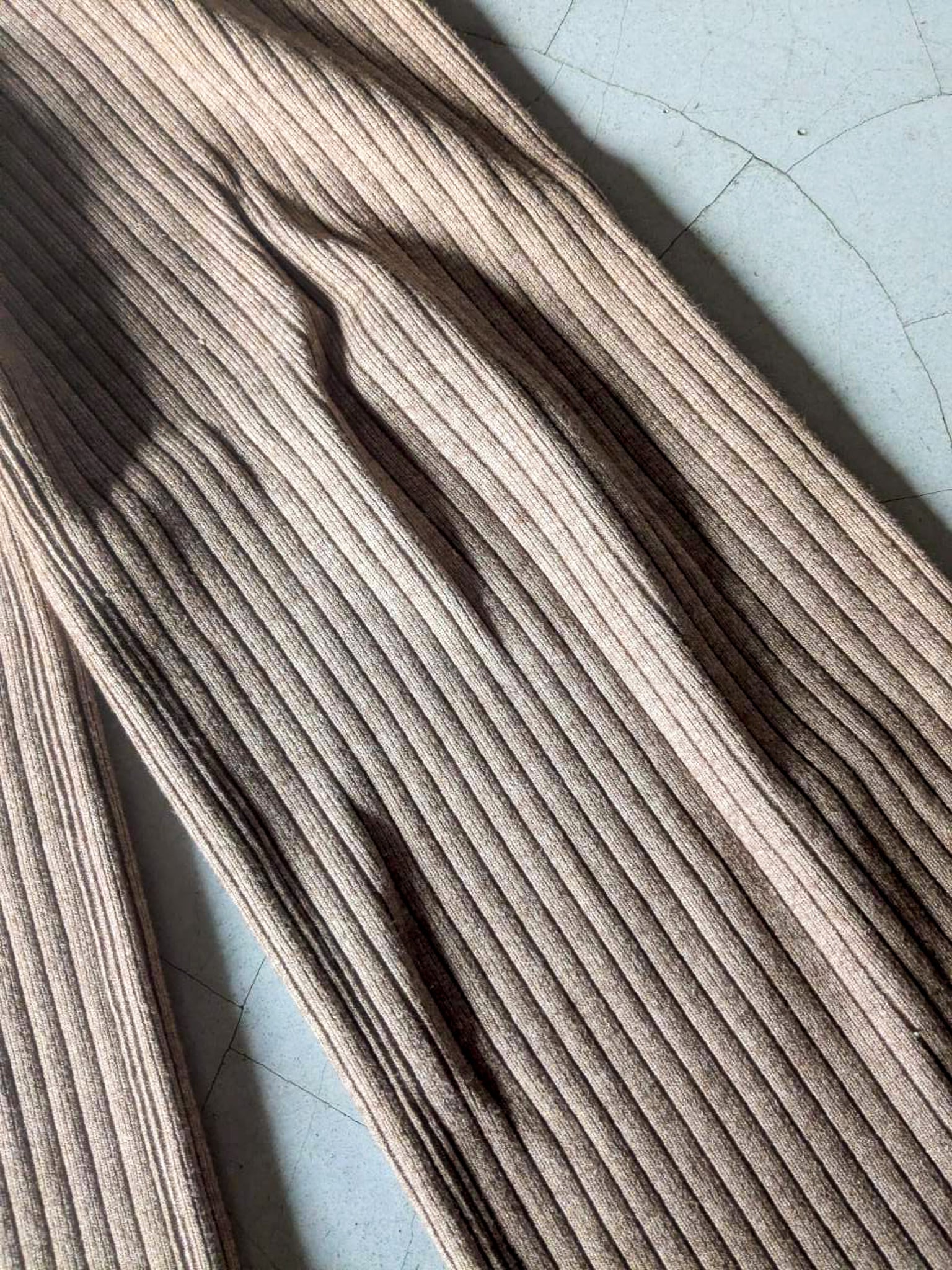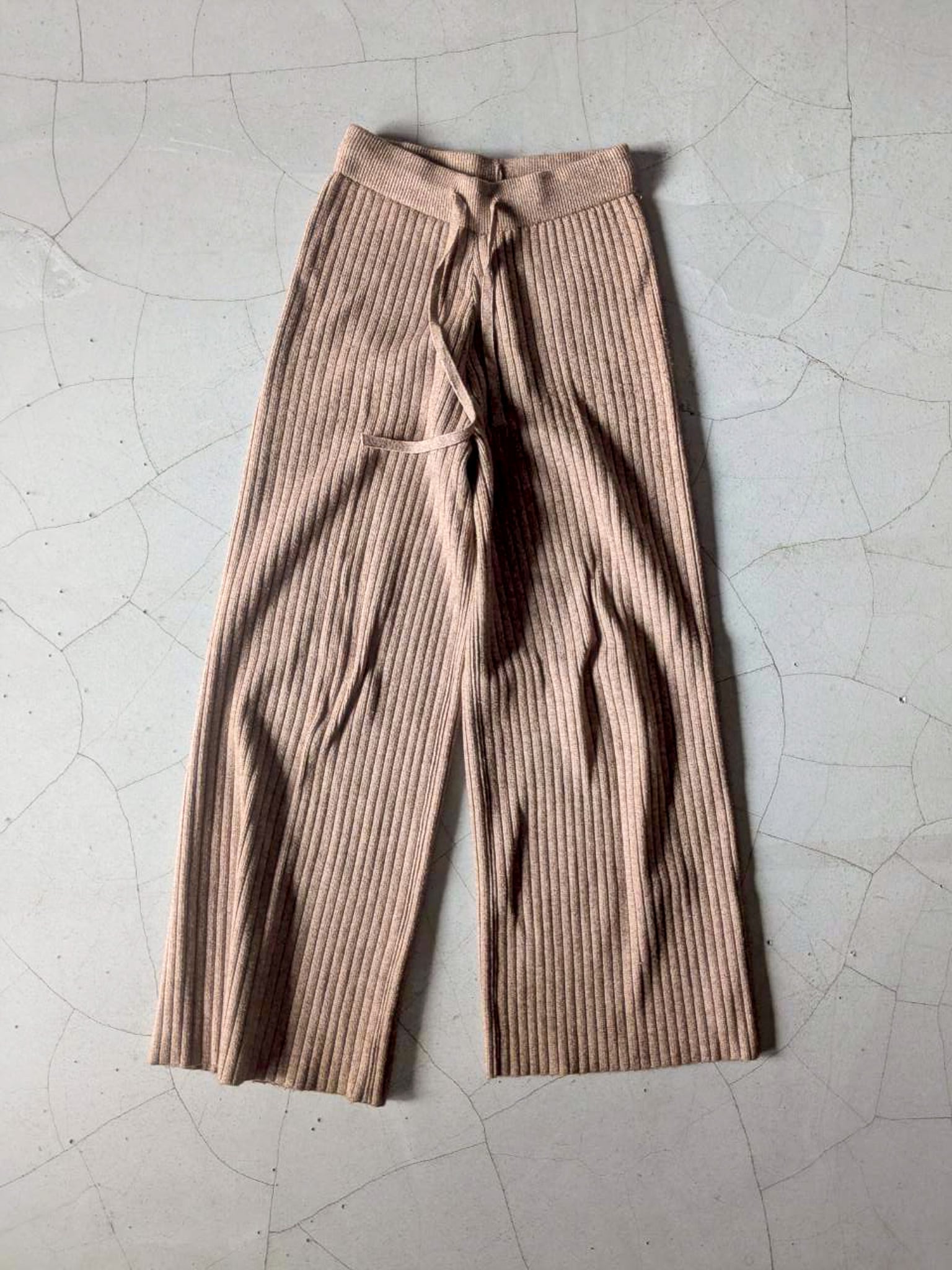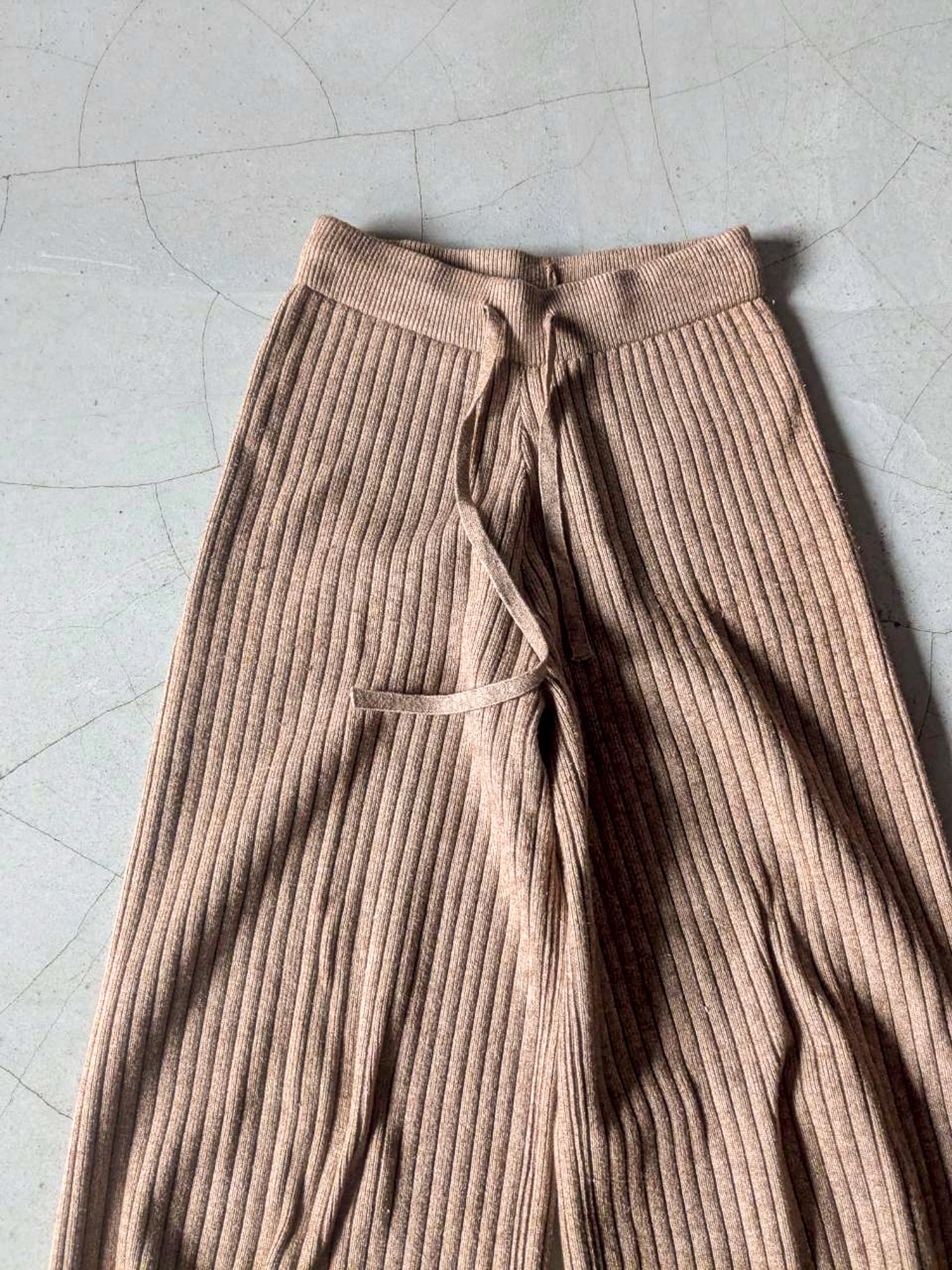 リブ編みのニットパンツ ウエストゴム仕様で裾にかけてフレアになっているのでスタイル良く見えます◎ 一枚で暖かいです 総丈 90cm ウエスト 60cm(ウエストゴム仕様) 股上 33cm 裾幅 27cm 153cm