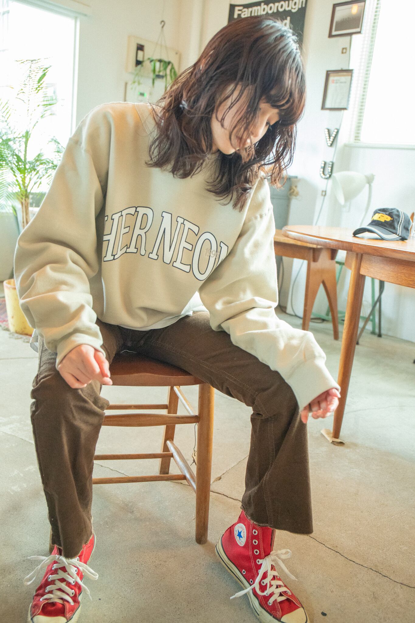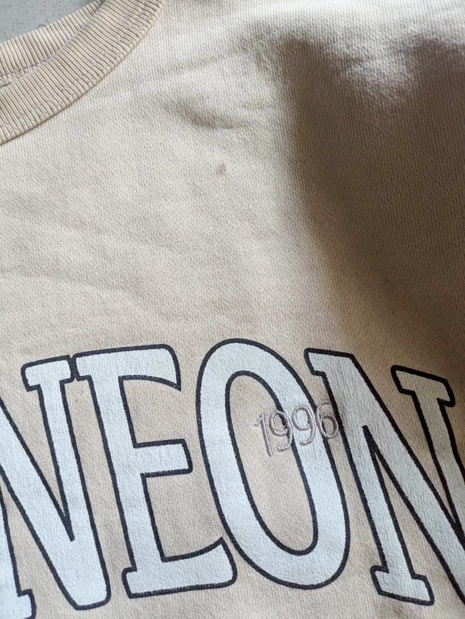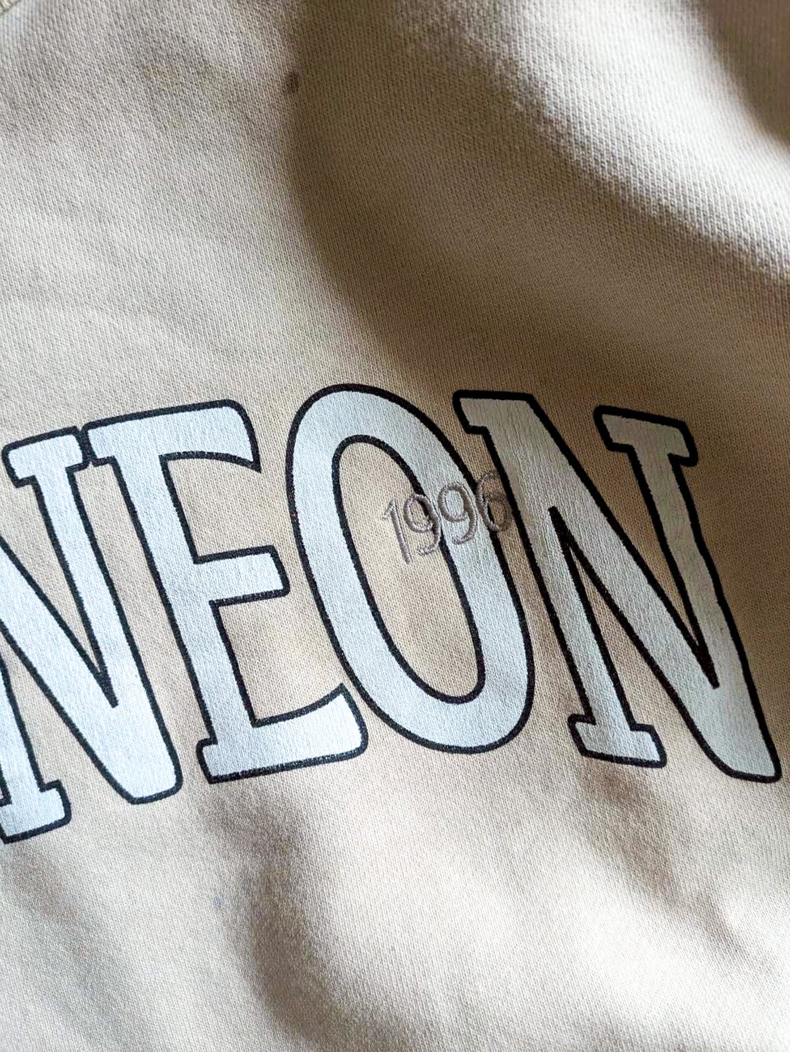 シルクスクリーンで手刷りしていただいた大きめHER NEONロゴ+Oの文字に被せて1996の刺繍が入っています。