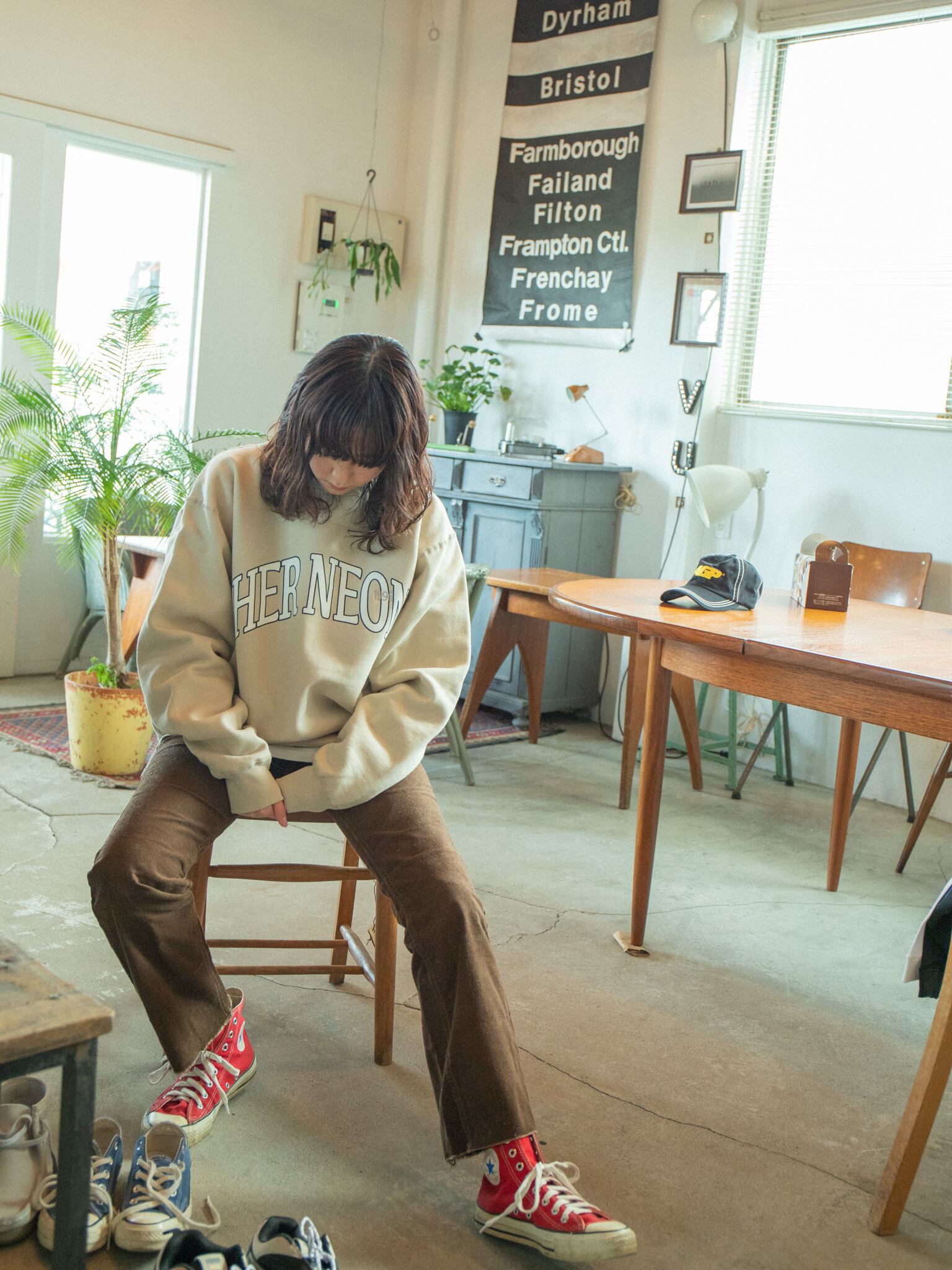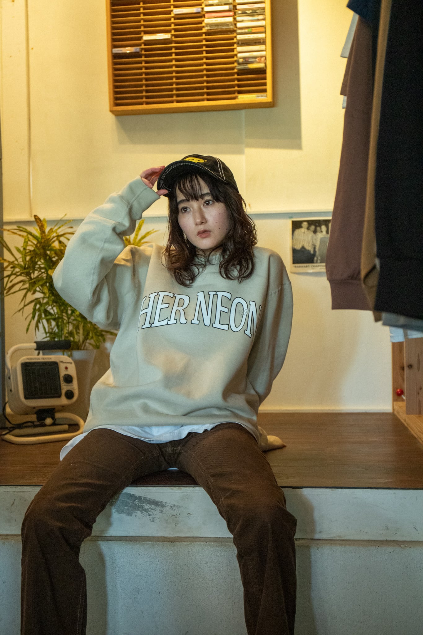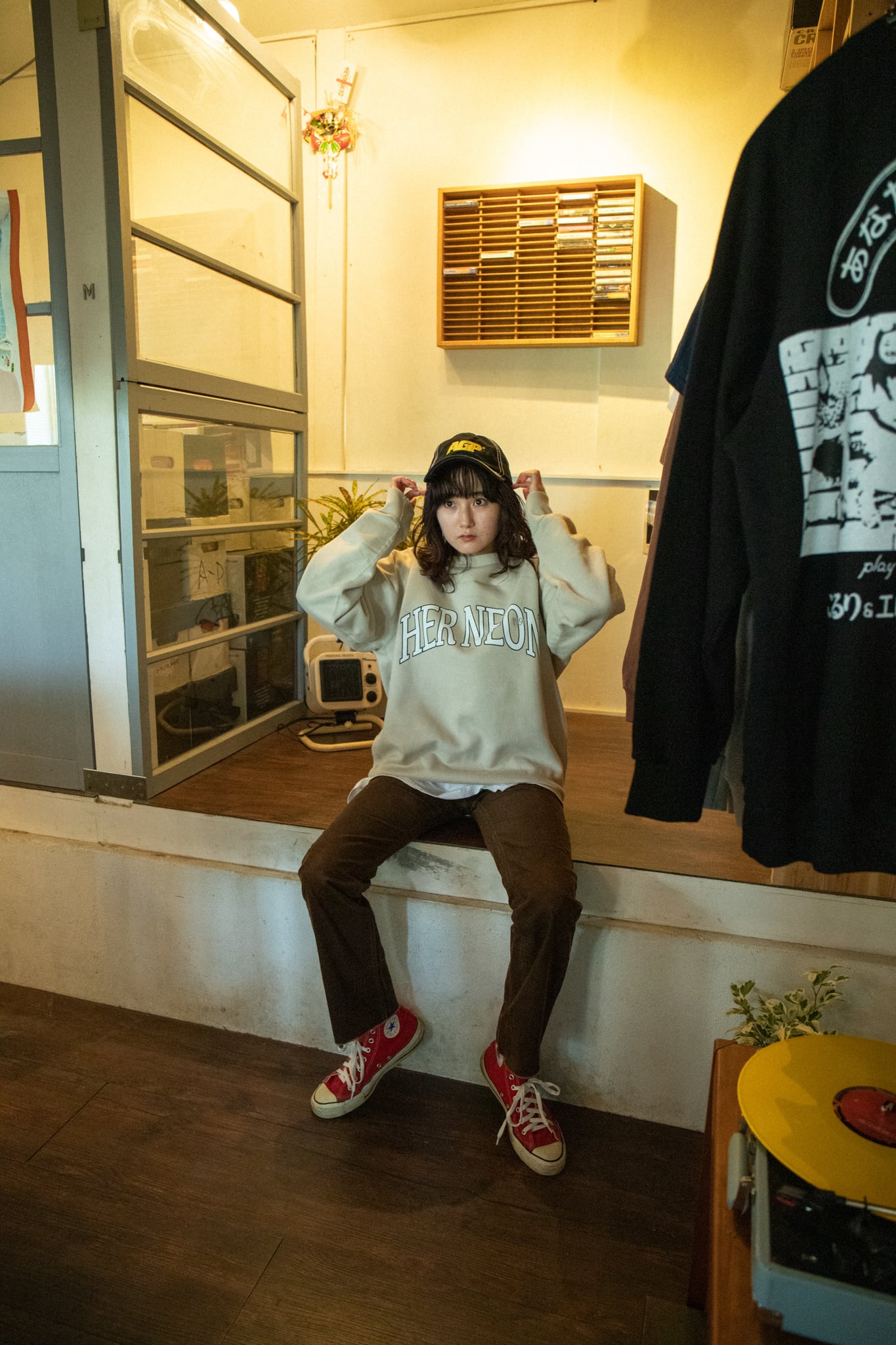 シルクスクリーンで手刷りしていただいた大きめHER NEONロゴ+Oの文字に被せて1996の刺繍が入っています。