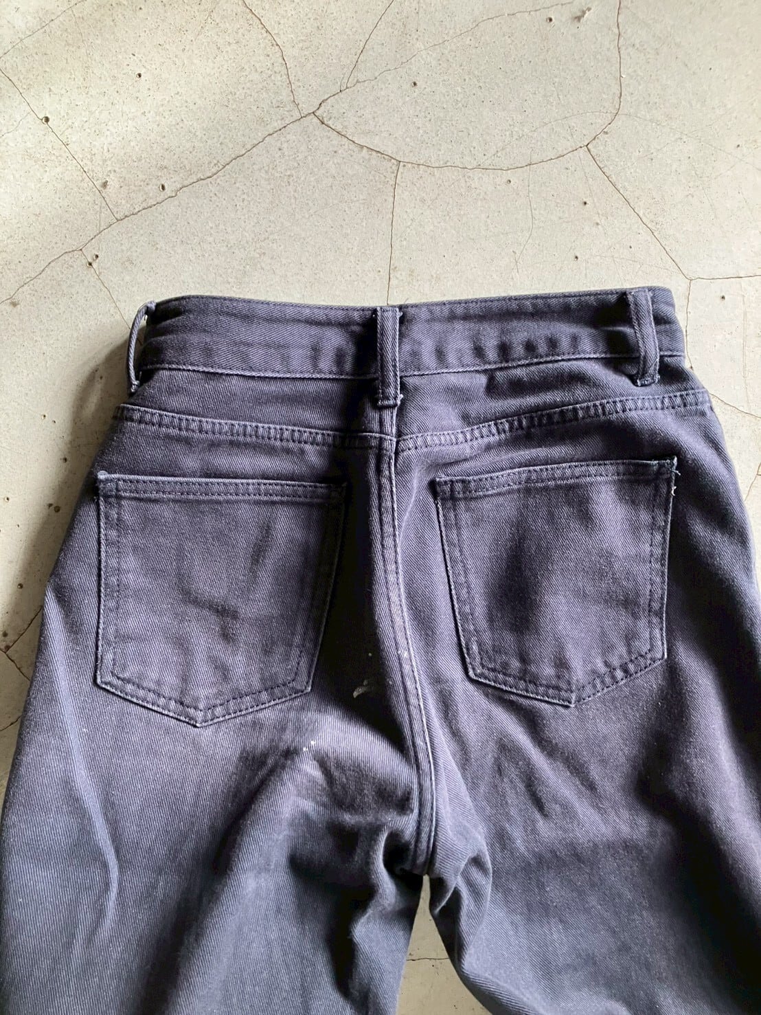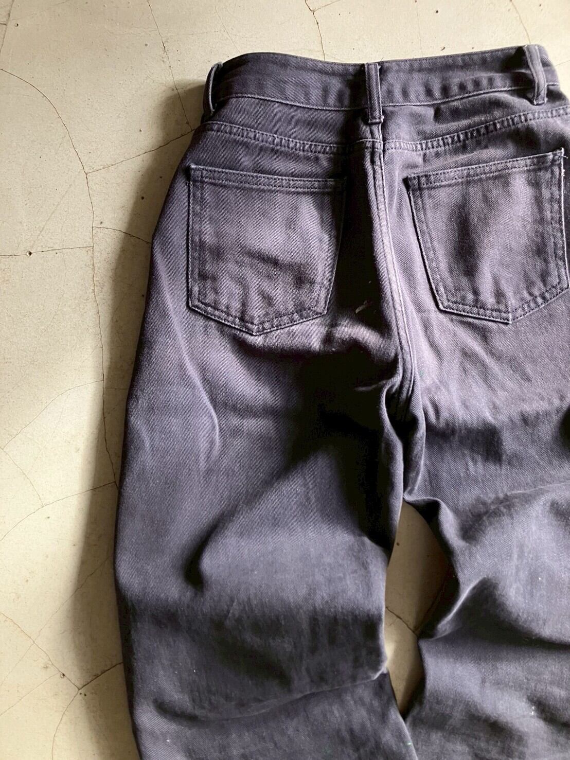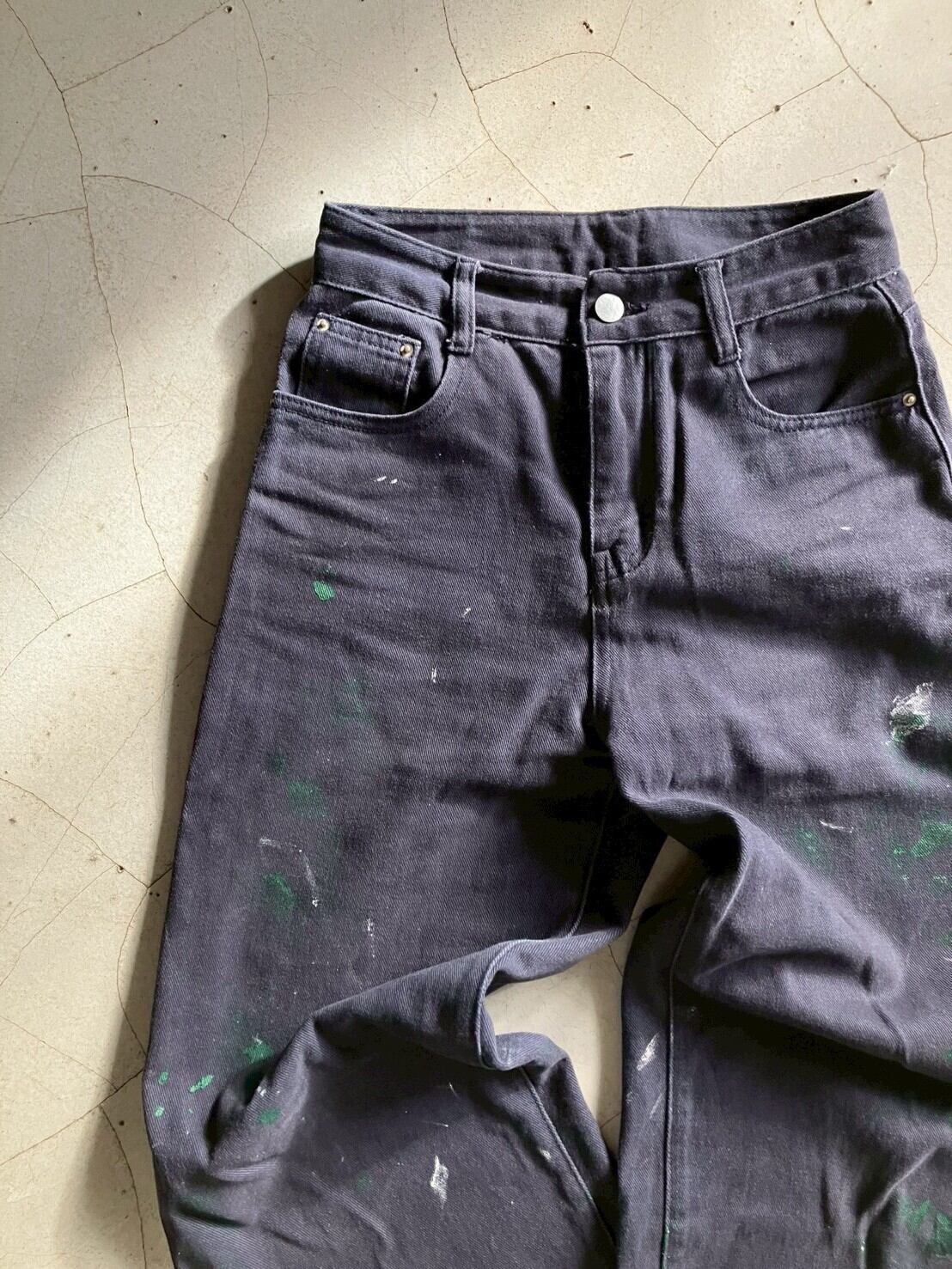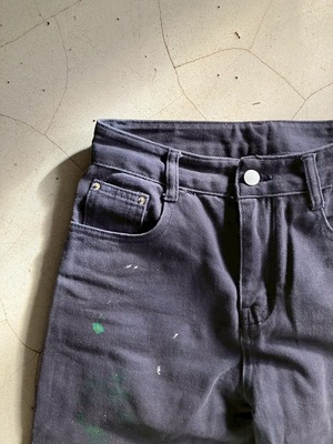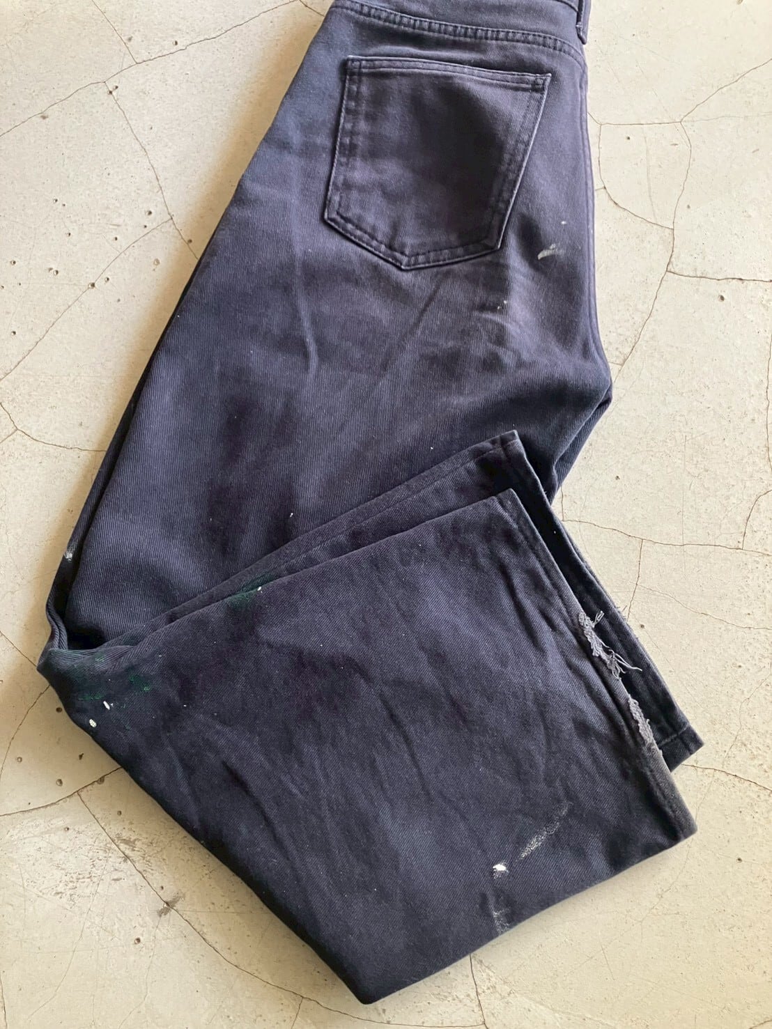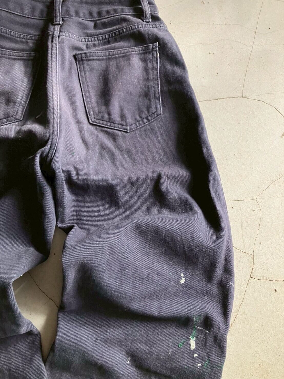 ネイビーのコットンボトムス 色褪せにペイント 丈は短めにお直ししています 裾ダメージあり ウエスト32 ワタリ29 股上29 股下65 153cm ※ お客様都合による注文のキャンセル、返品、サイズ交換はできませんのでご了承ください ※ 汚れや状態などあくまでUSED商品であることをご理解の上お求めください