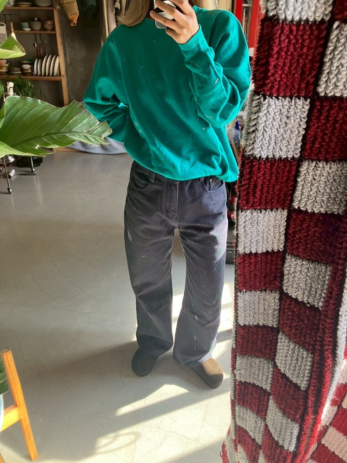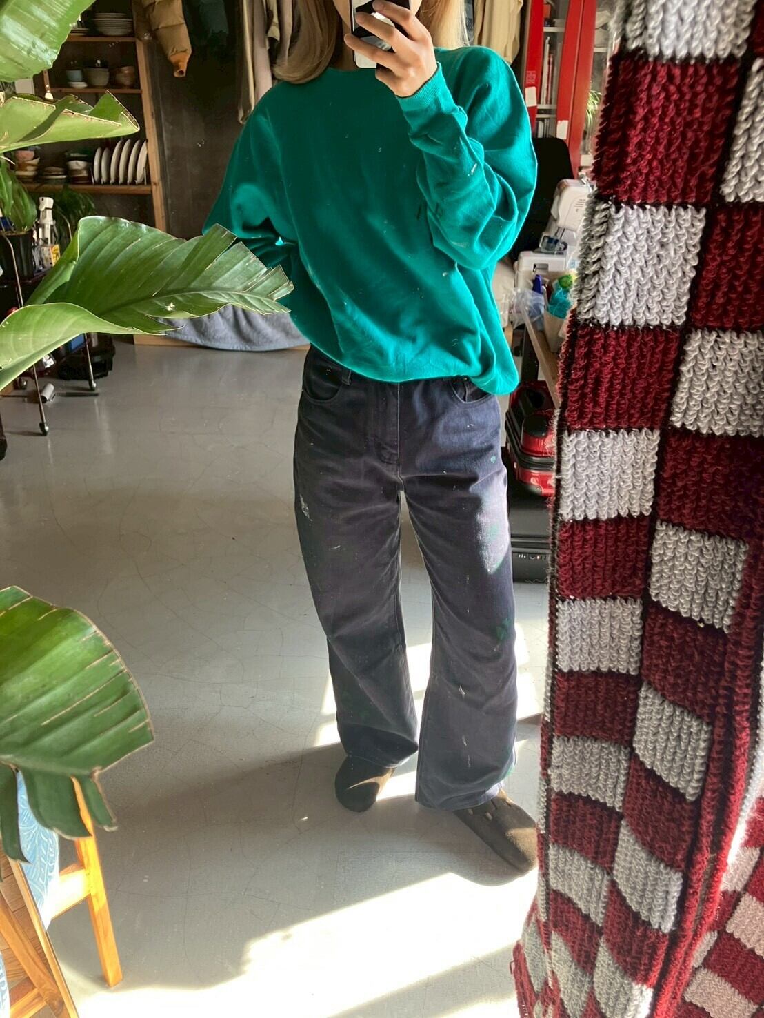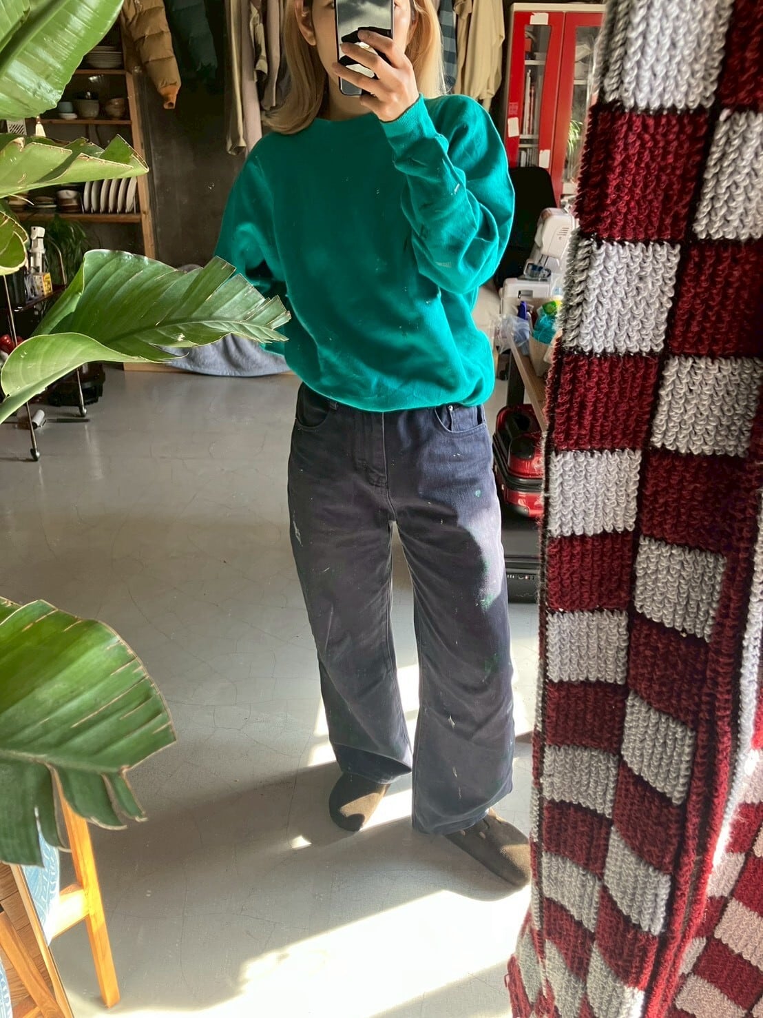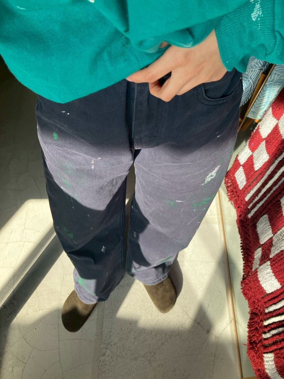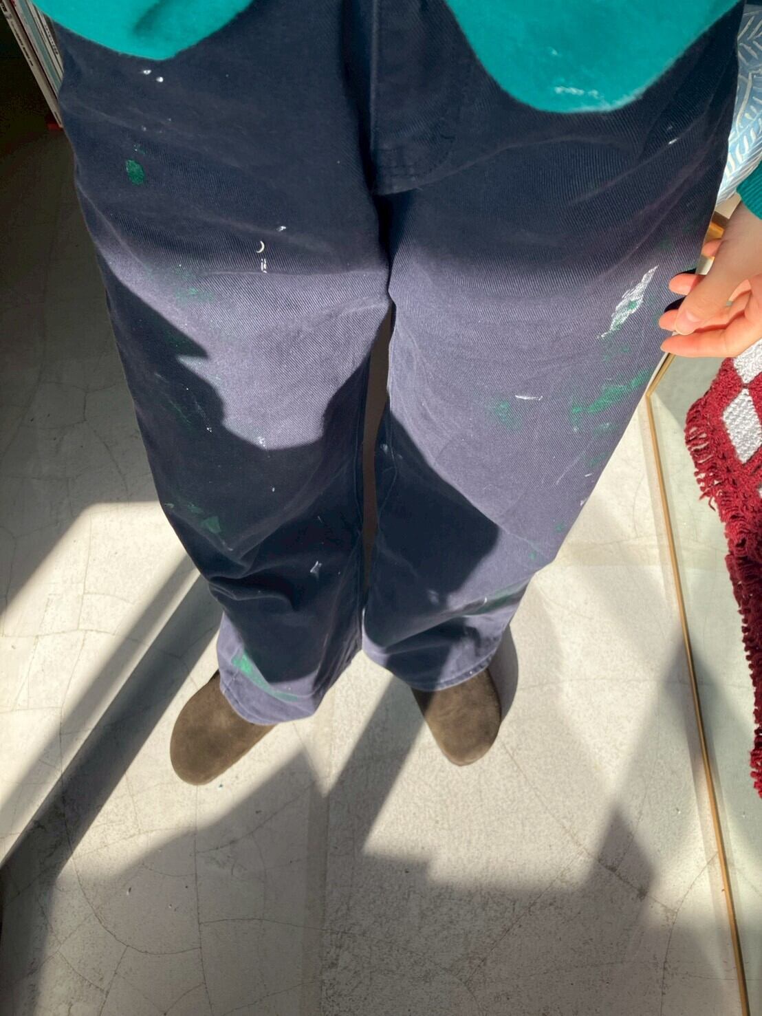 ネイビーのコットンボトムス 色褪せにペイント 丈は短めにお直ししています 裾ダメージあり ウエスト32 ワタリ29 股上29 股下65 153cm ※ お客様都合による注文のキャンセル、返品、サイズ交換はできませんのでご了承ください ※ 汚れや状態などあくまでUSED商品であることをご理解の上お求めください