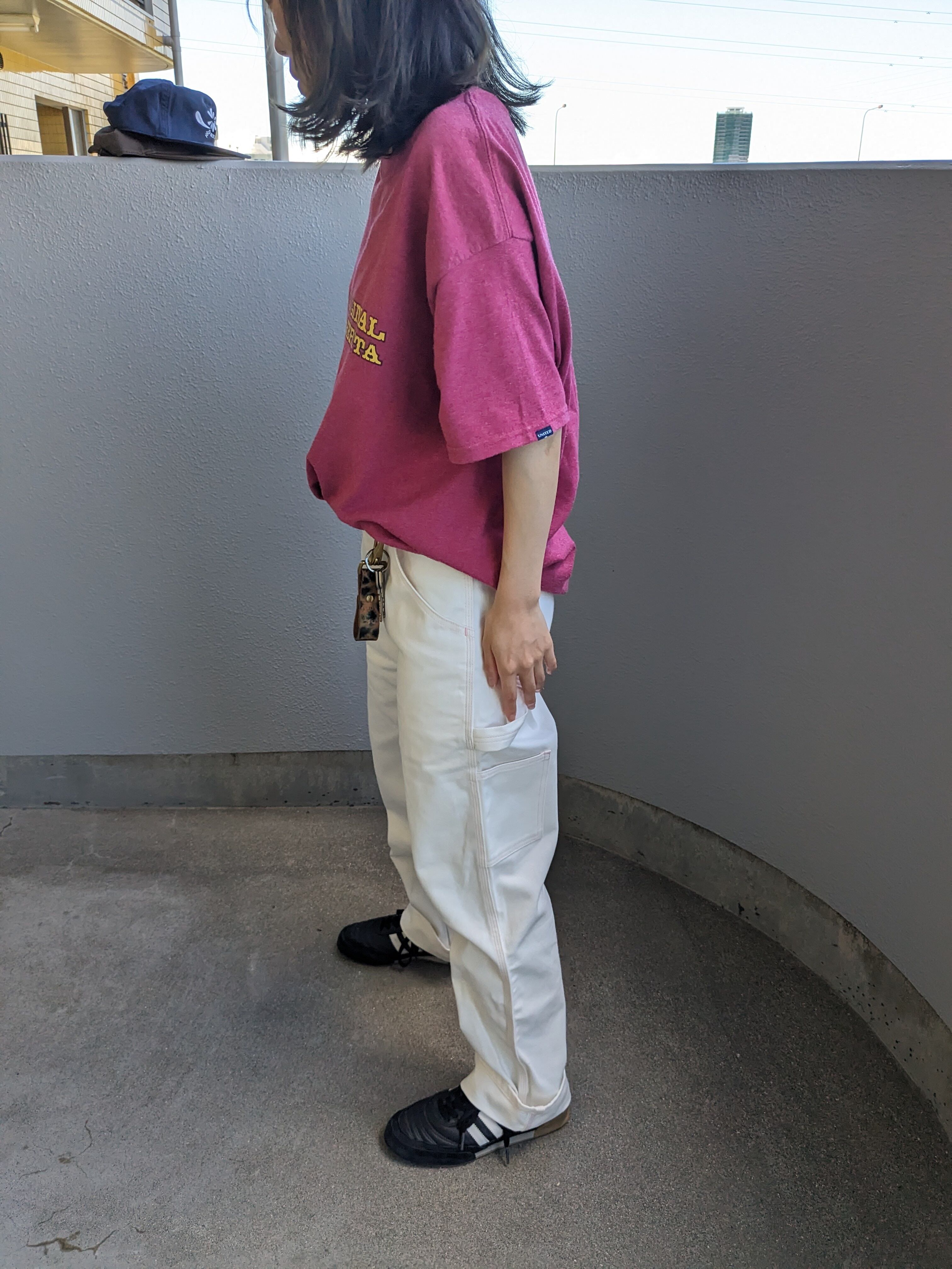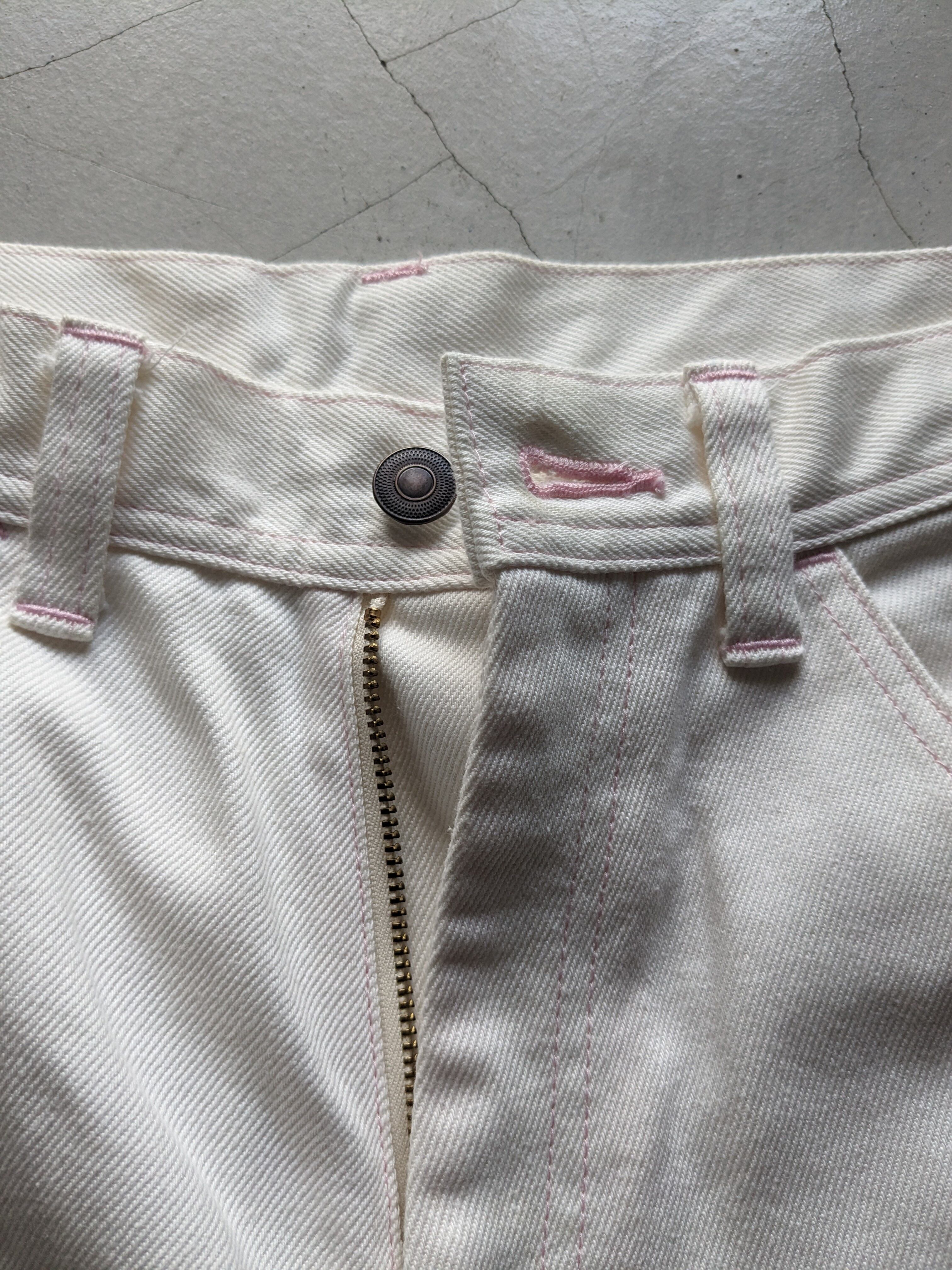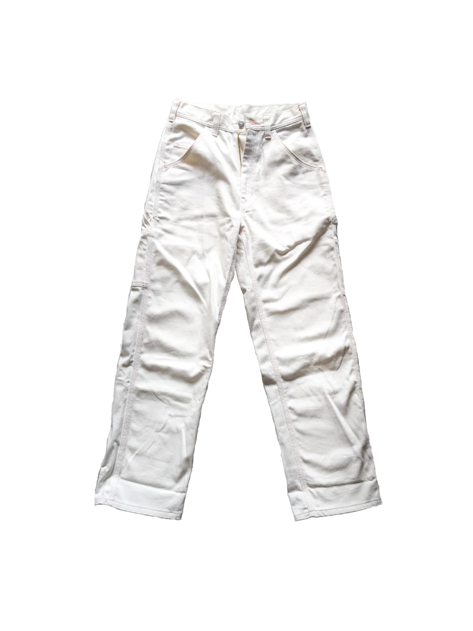 ハーネオンオリジナルパターンのペインターパンツ サンプルでカーキとホワイトの2カラーを製作したものです ホワイトのボディにピンクのステッチがアクセント 肉厚な生地を使っており、かなりタフなペインターパンツです 履き込んで自分のものに育ててください ■サイズ ウエスト34 股上30 股下69