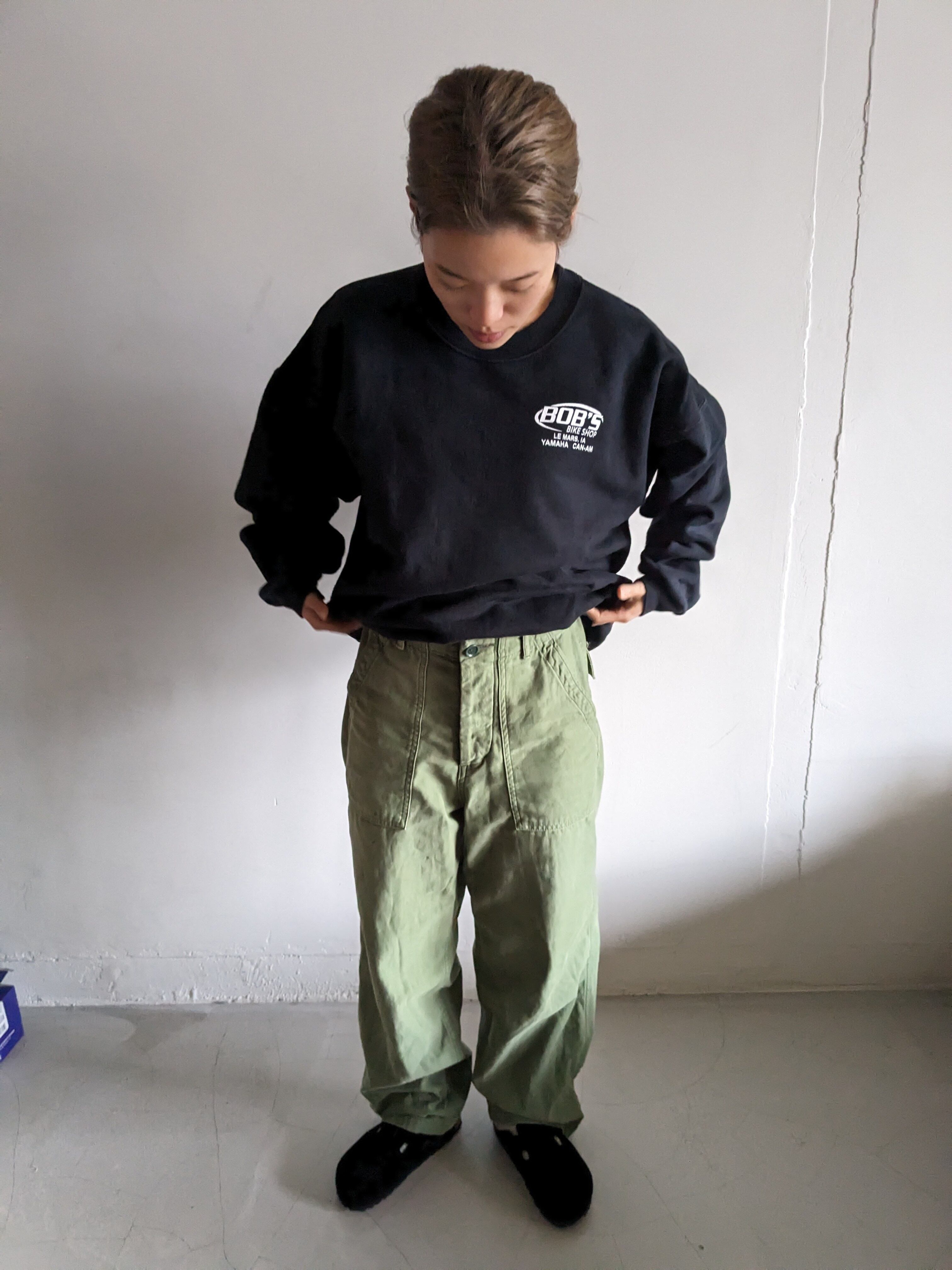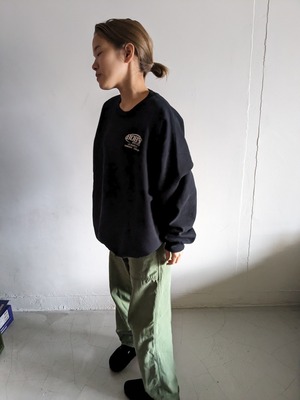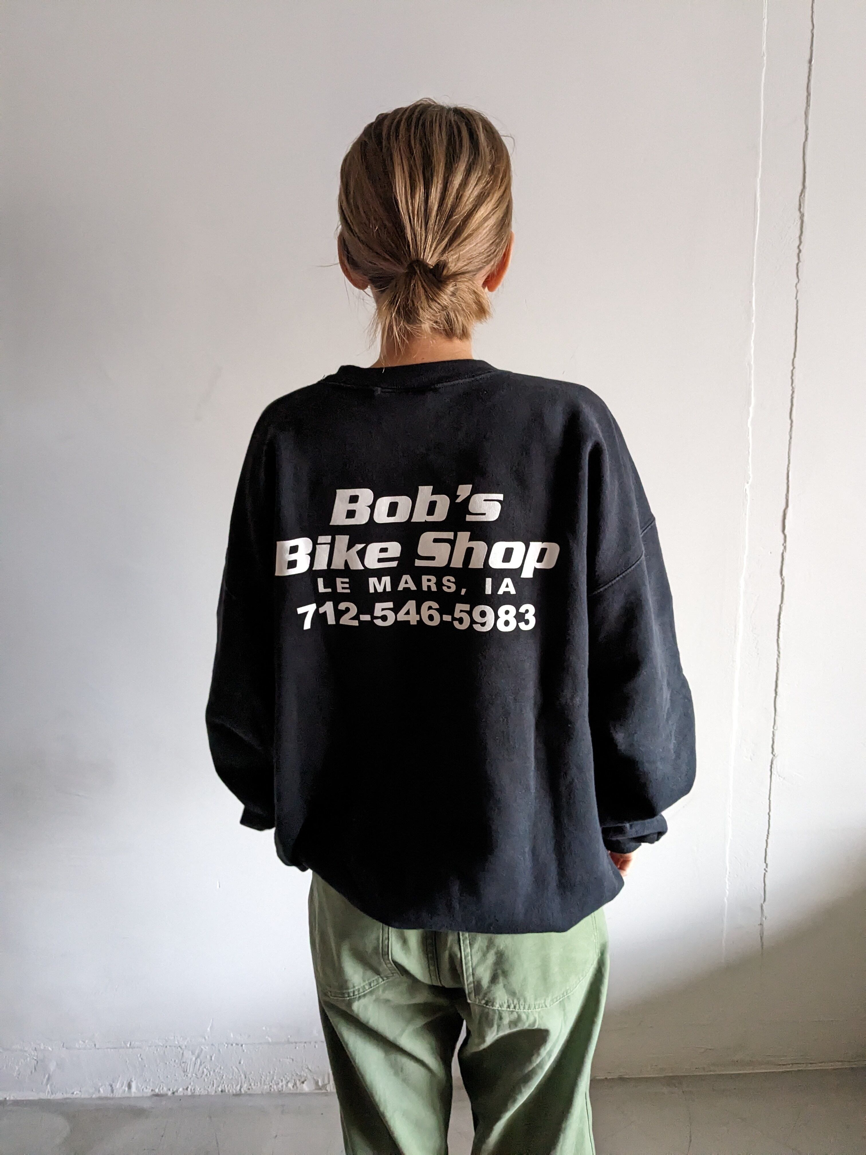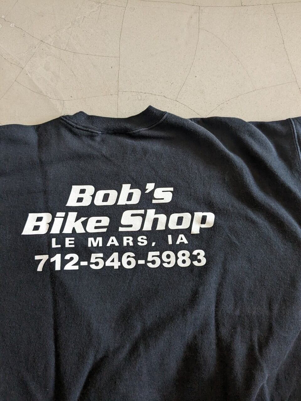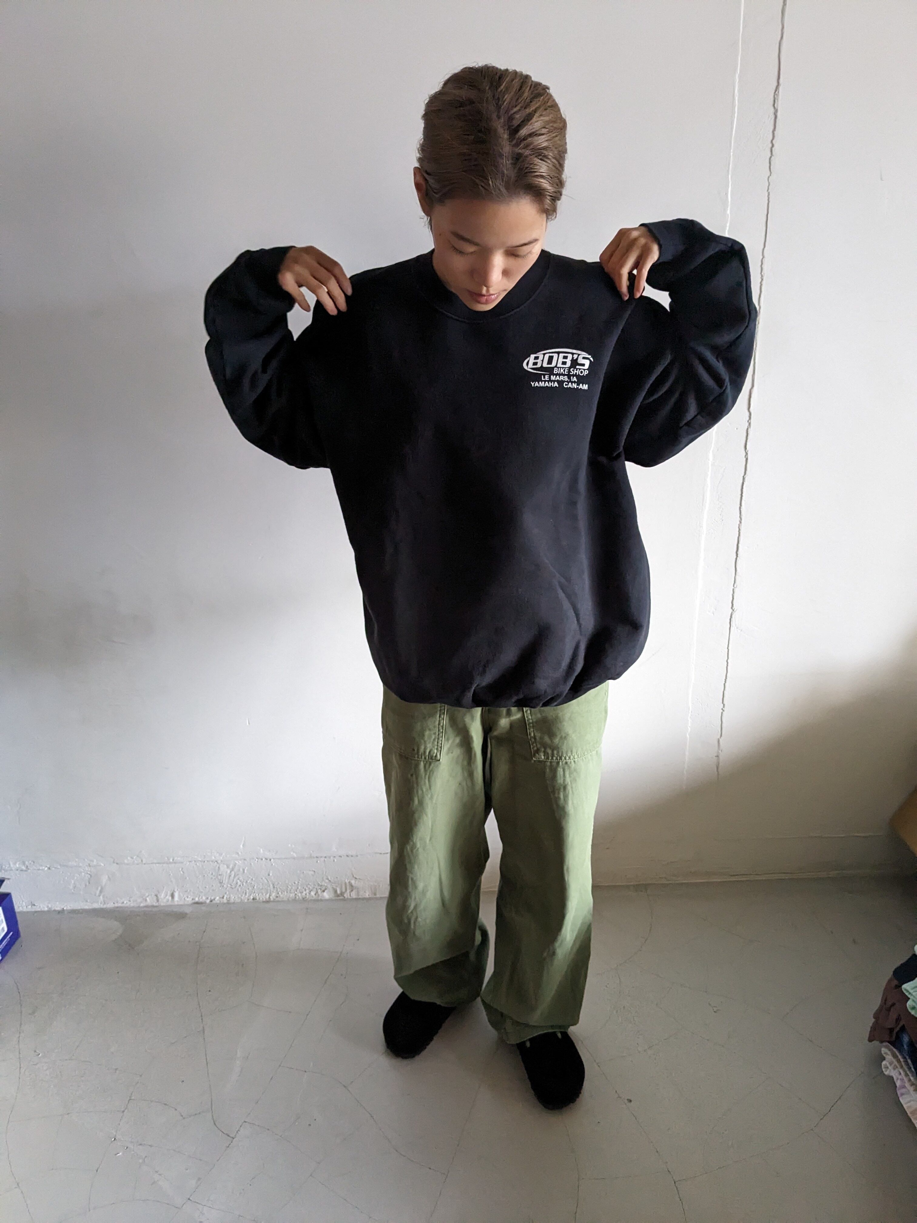 Hanes Ultimate cotton / BLACK L-size 流石のHanes 肉厚でがしがし着られるコットンスウェットです どこかバイク屋さんのユニフォームでしょうか 作った人や着ていた人を想像しながらの服選びは楽しいです 画像では少し色が飛んで見えますが、スタンダードなブラック 着丈65 身幅64 肩幅64
