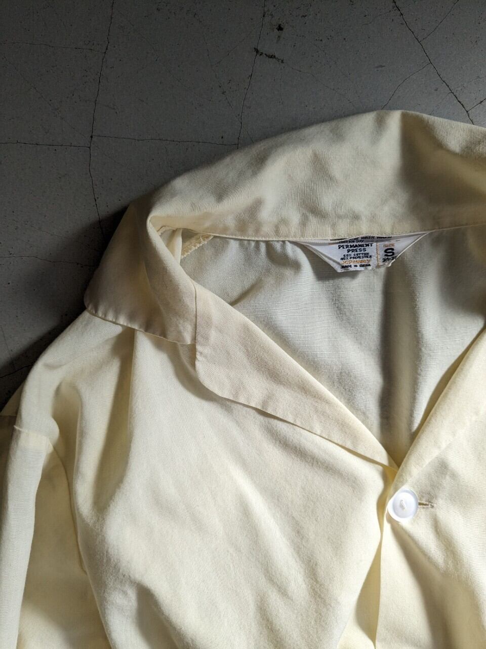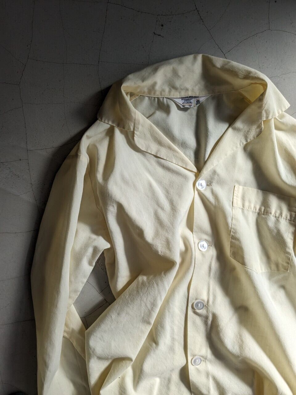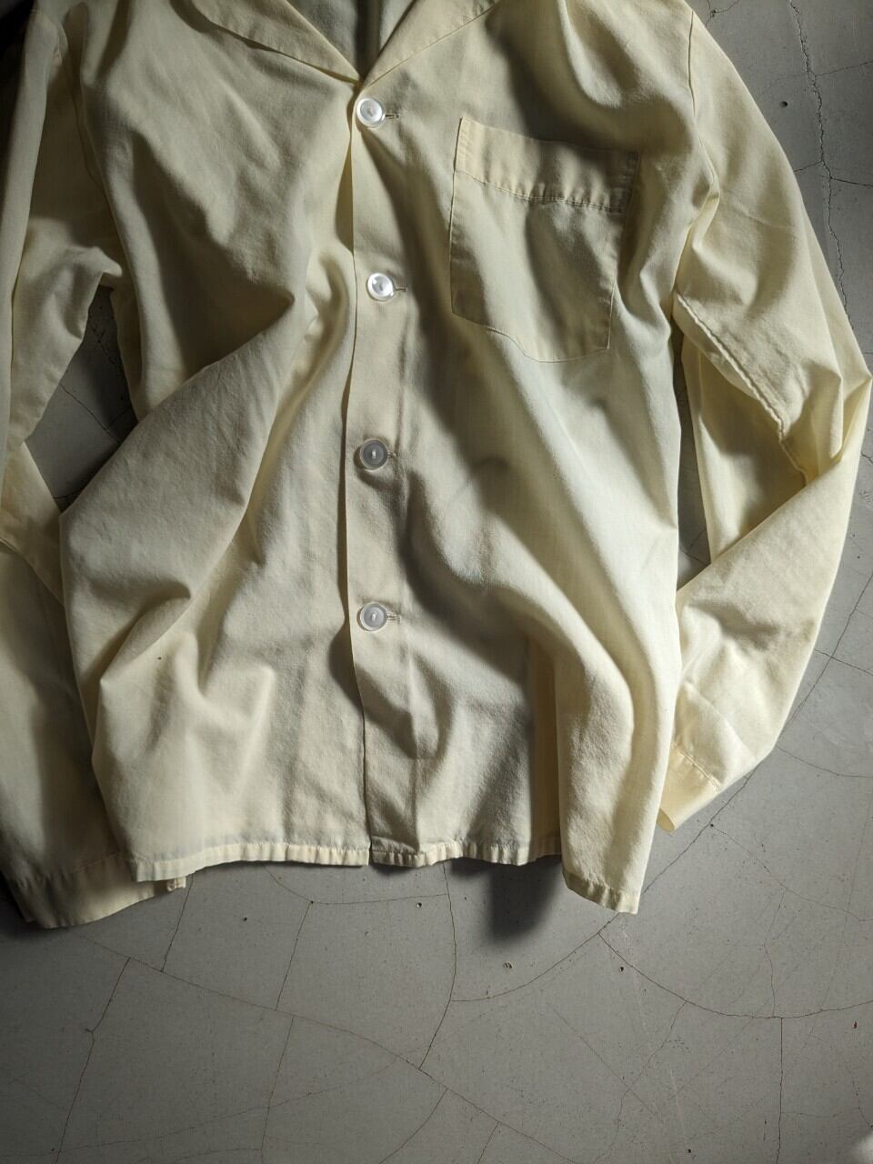 なかなか見ないペールイエローのシアーシャツ 軽やかなシャツです ニットベスト合わせもいいし、今の時期はカーディガンとのレイヤードもおすすめ パジャマっぽく着てもかっこいいと思います 胸元はオープンカラー仕様(開襟シャツ)で肌見せもナチュラルに可能 S 着丈70 身幅43 肩幅49 コットン55 ポリエステル45
