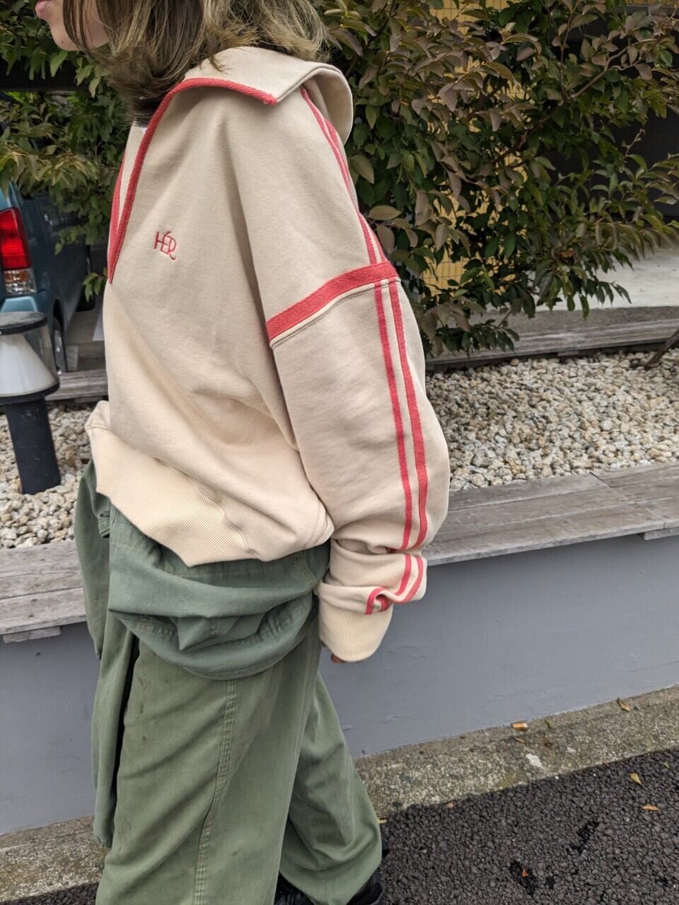 2023aw 販売しているものと同じものです Beige×Red 撮影使用 ポップアップ展示品です 美品 少し置き画色が飛んでいますが、着画とほぼ同じお色味です XL <素材> 表地:綿100% リブ:綿95% ポリウタレン5% テープ:ポリエステル100% model:153cm / M