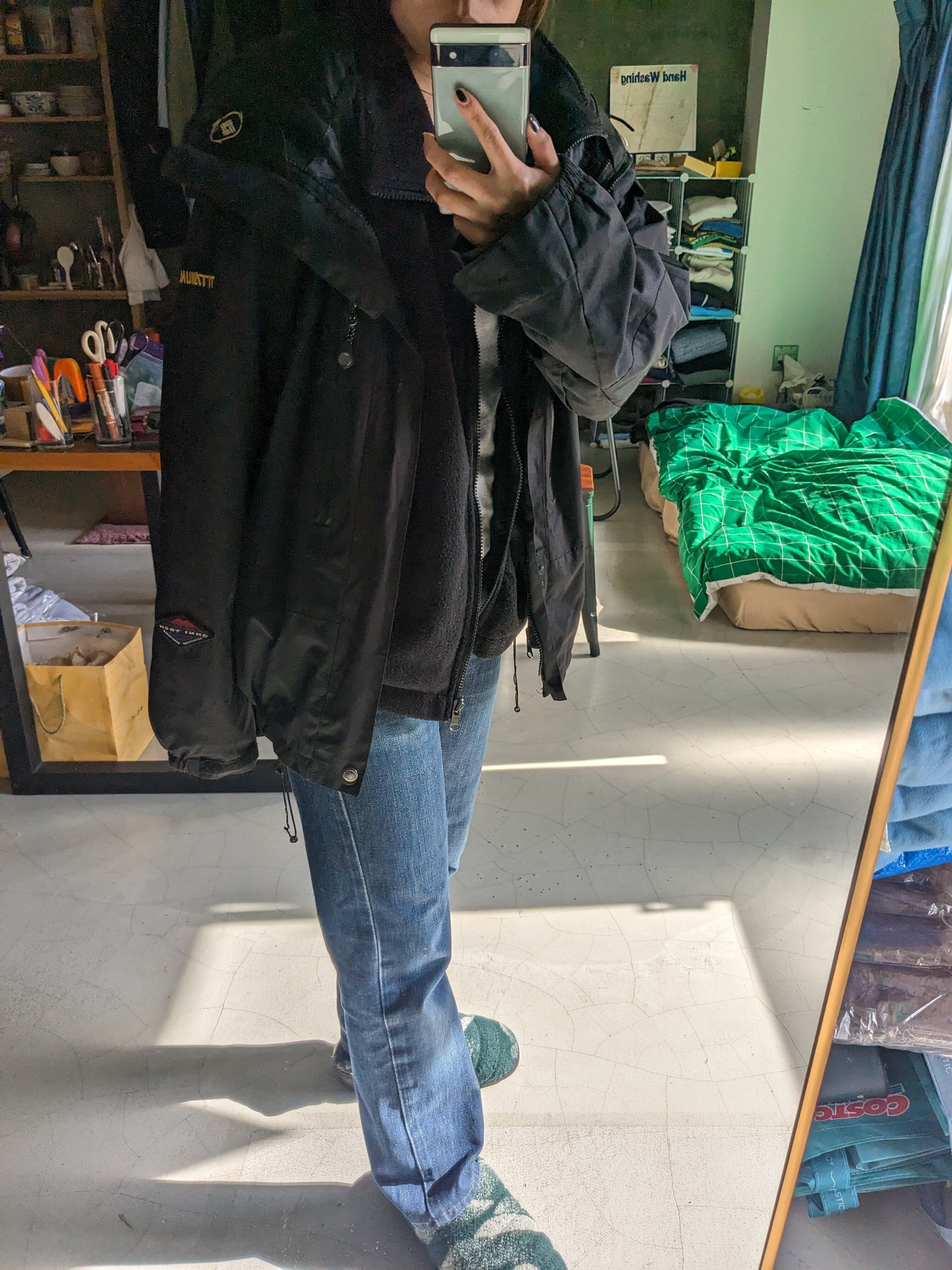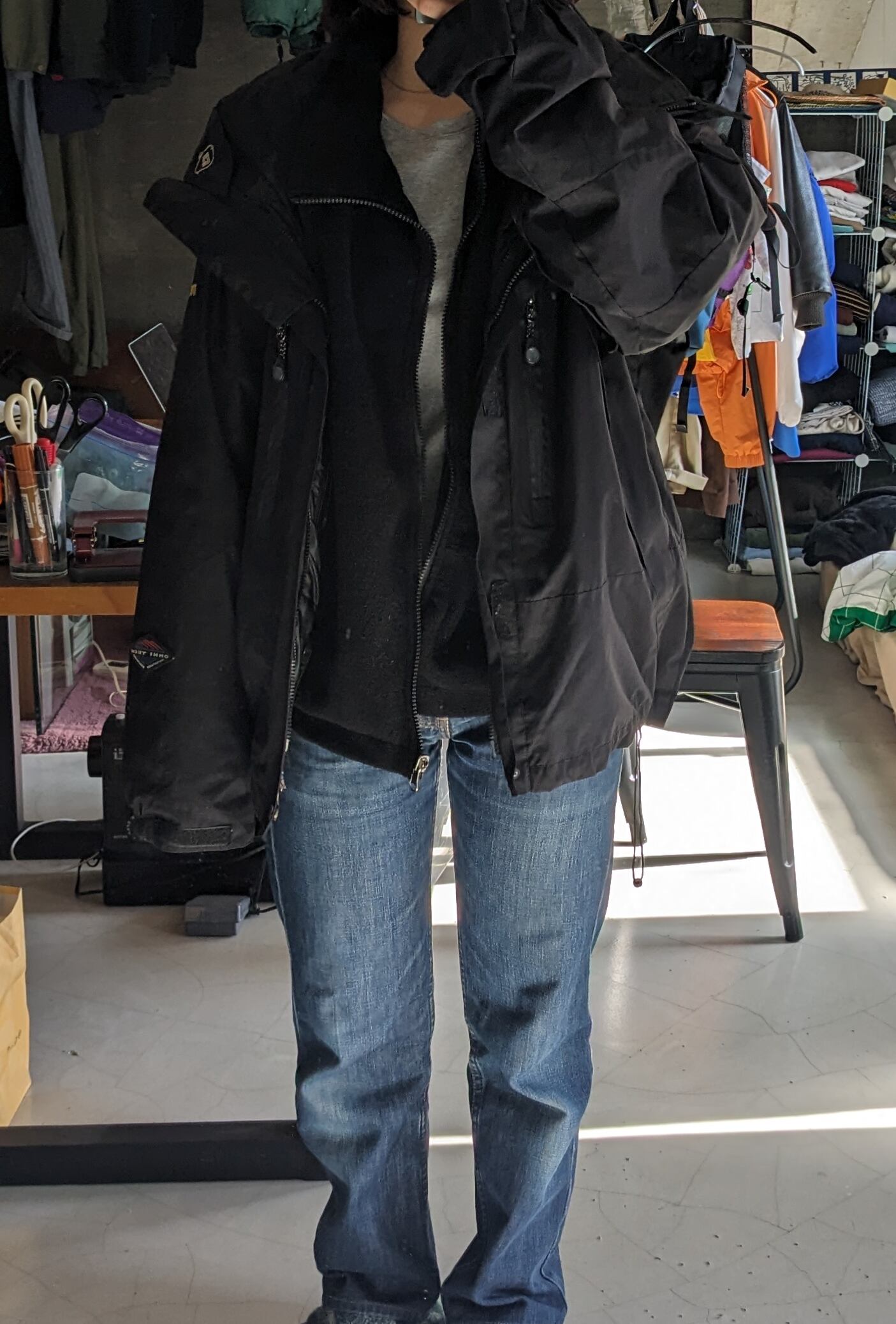 ジャケットはポケット4つ付き、裾、フード部分にドローコードが付いています。