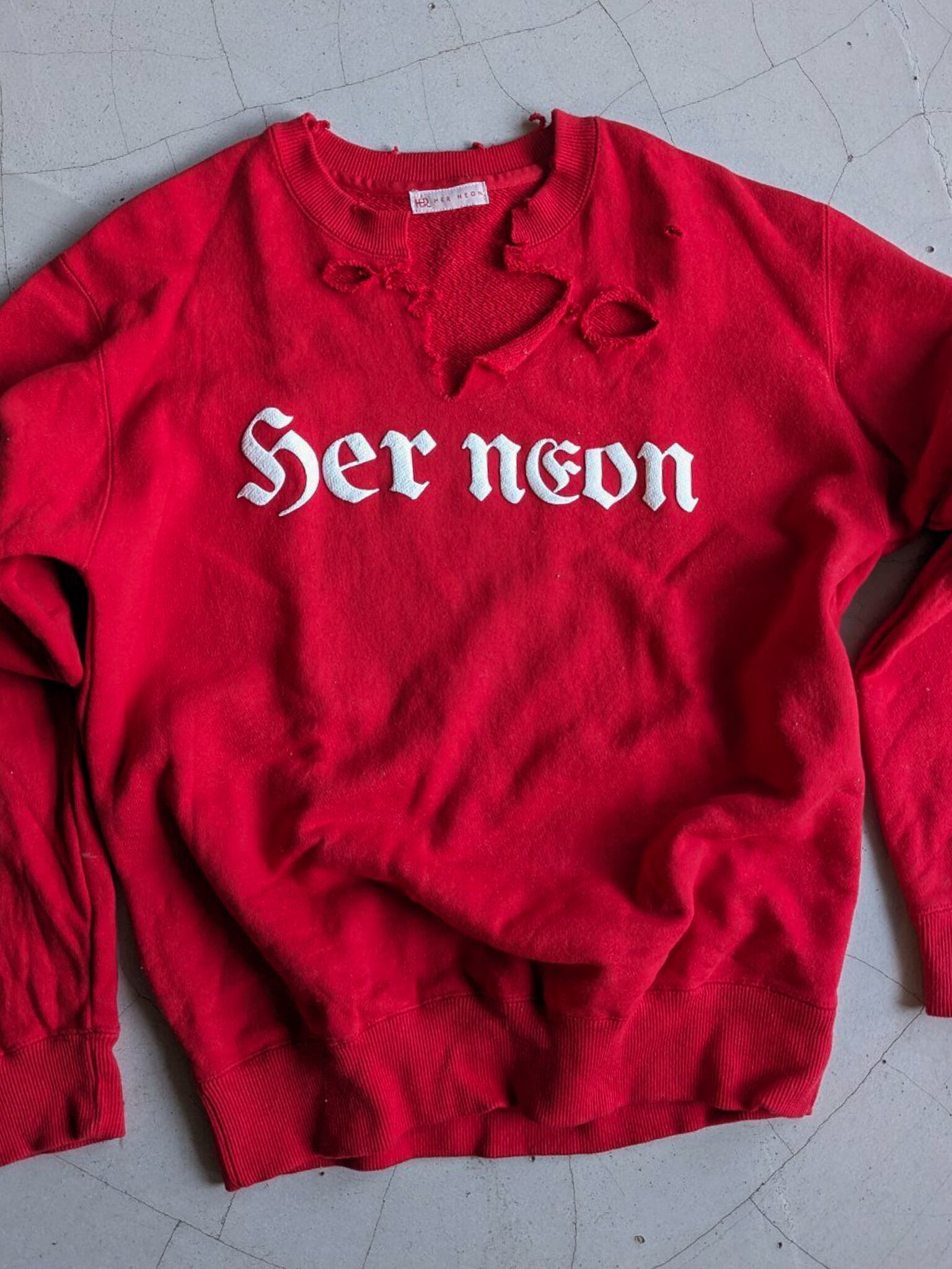 Foaming logo sweat / Red damage フロントの首元にV字に切り込みとダメージを入れました。 中に仕込むTシャツの色で印象がガラッと変わります。 size:M 着丈 62 身幅 51 肩幅 47