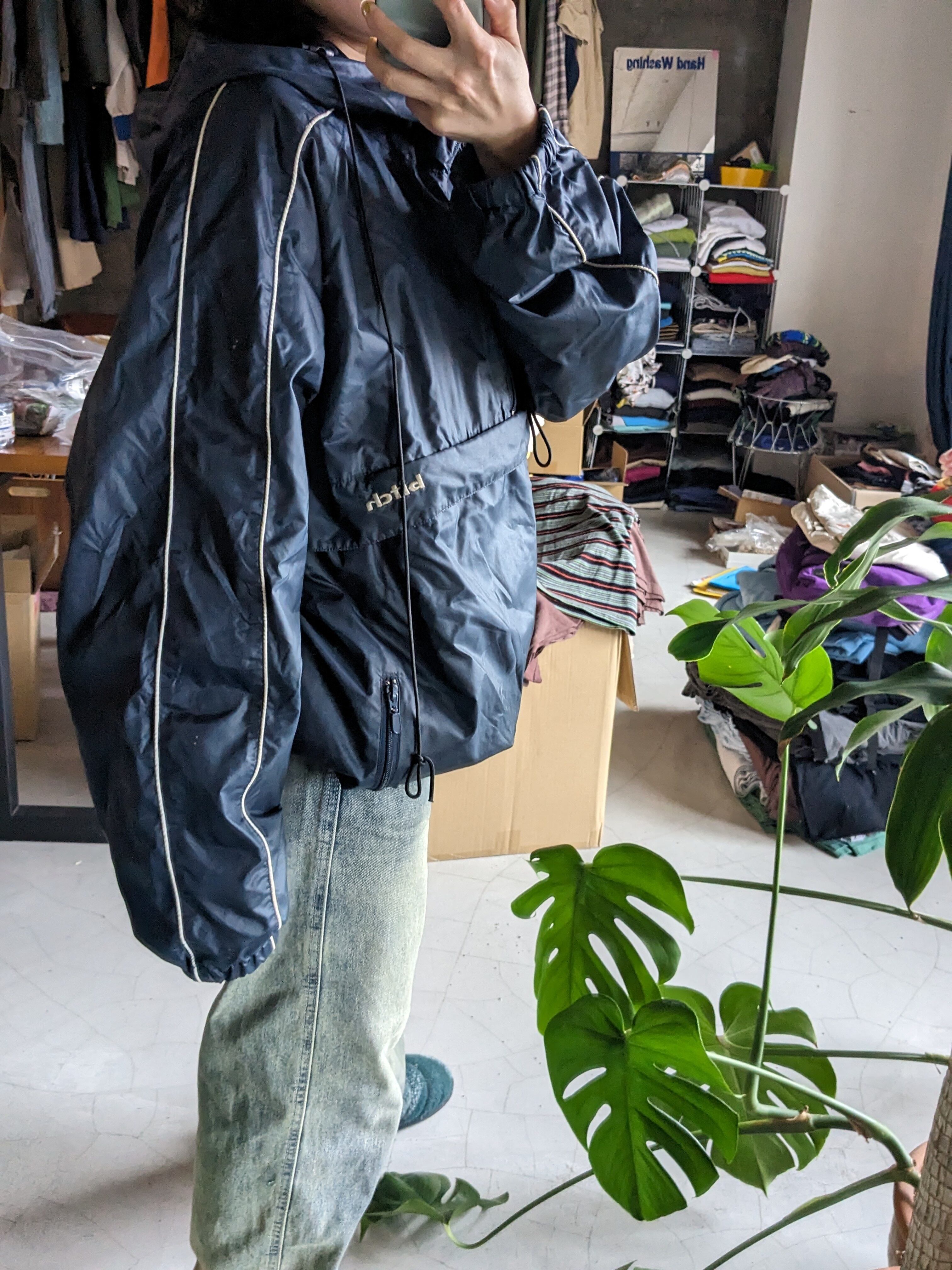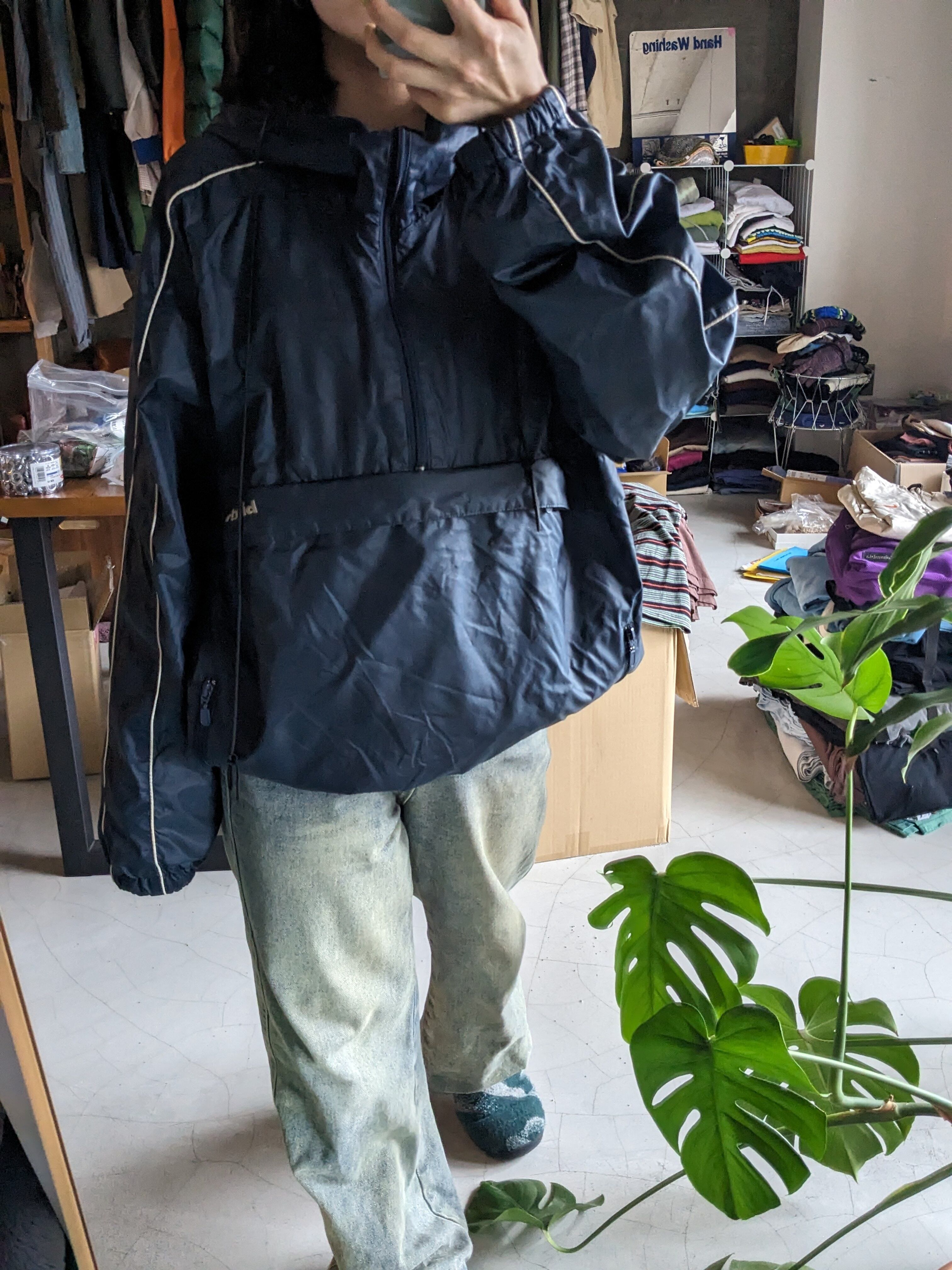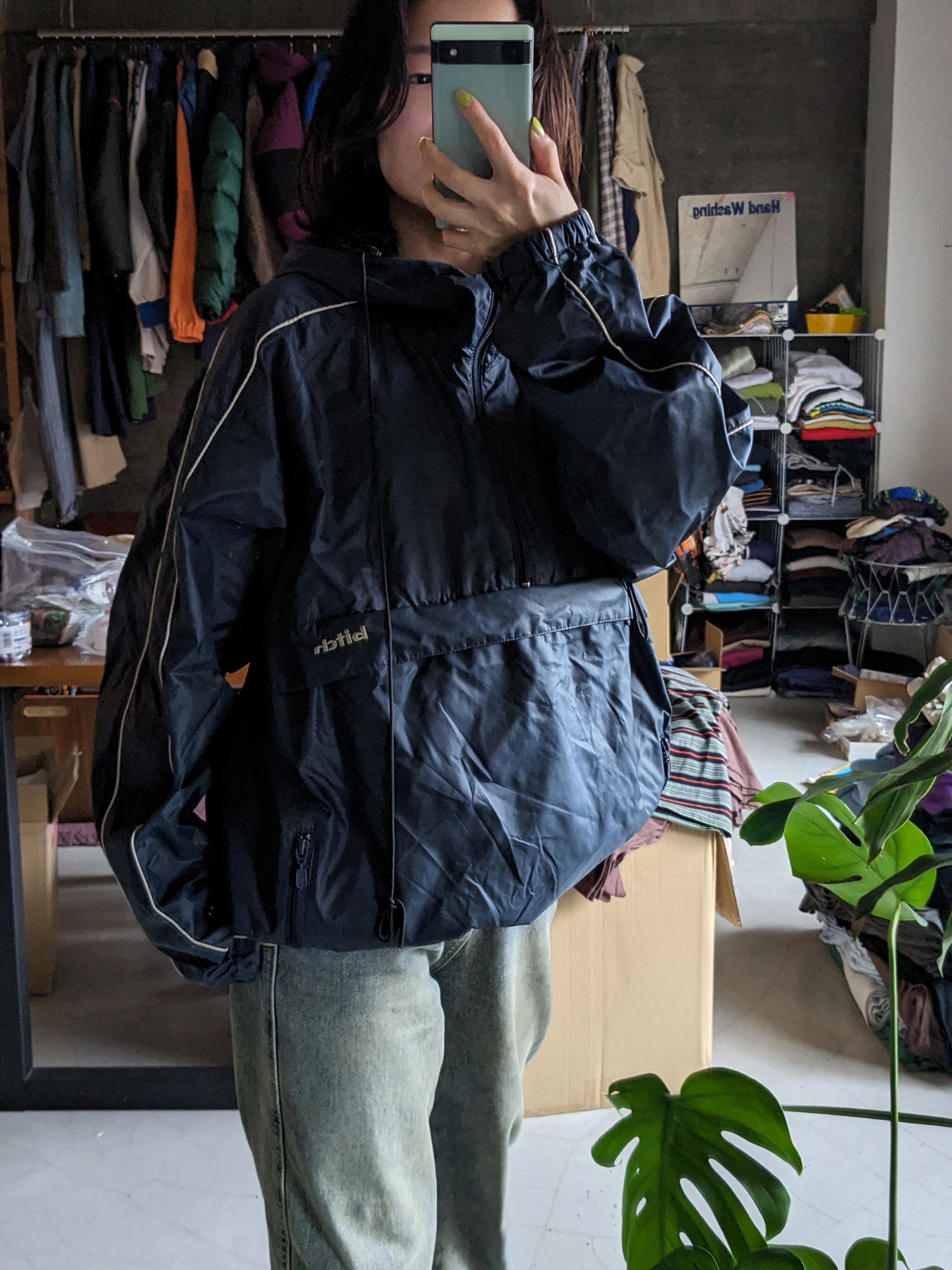フロントに大きめポケット、フード&裾にはドローコードがついているので、今の季節1枚持っておくと便利です。