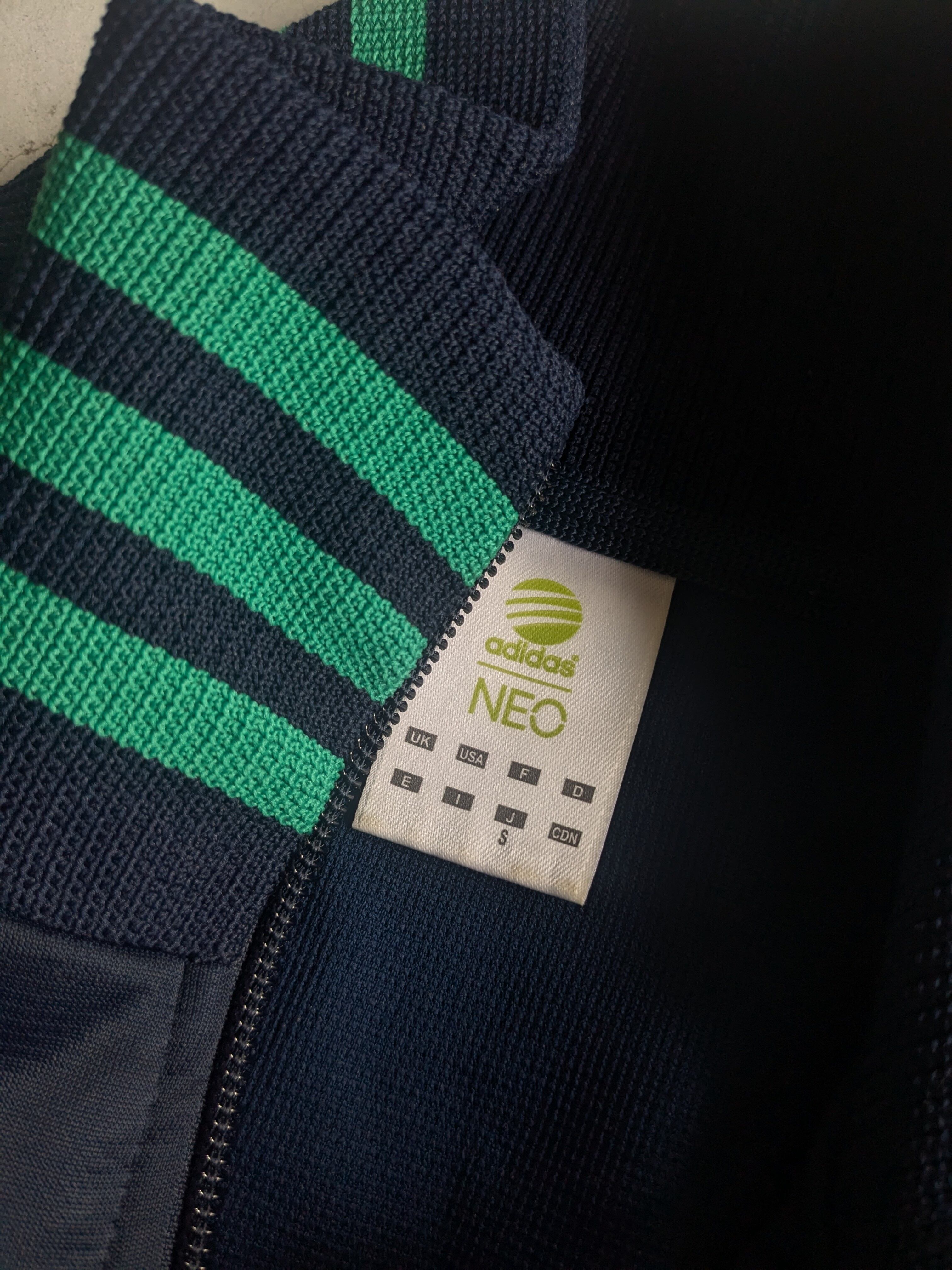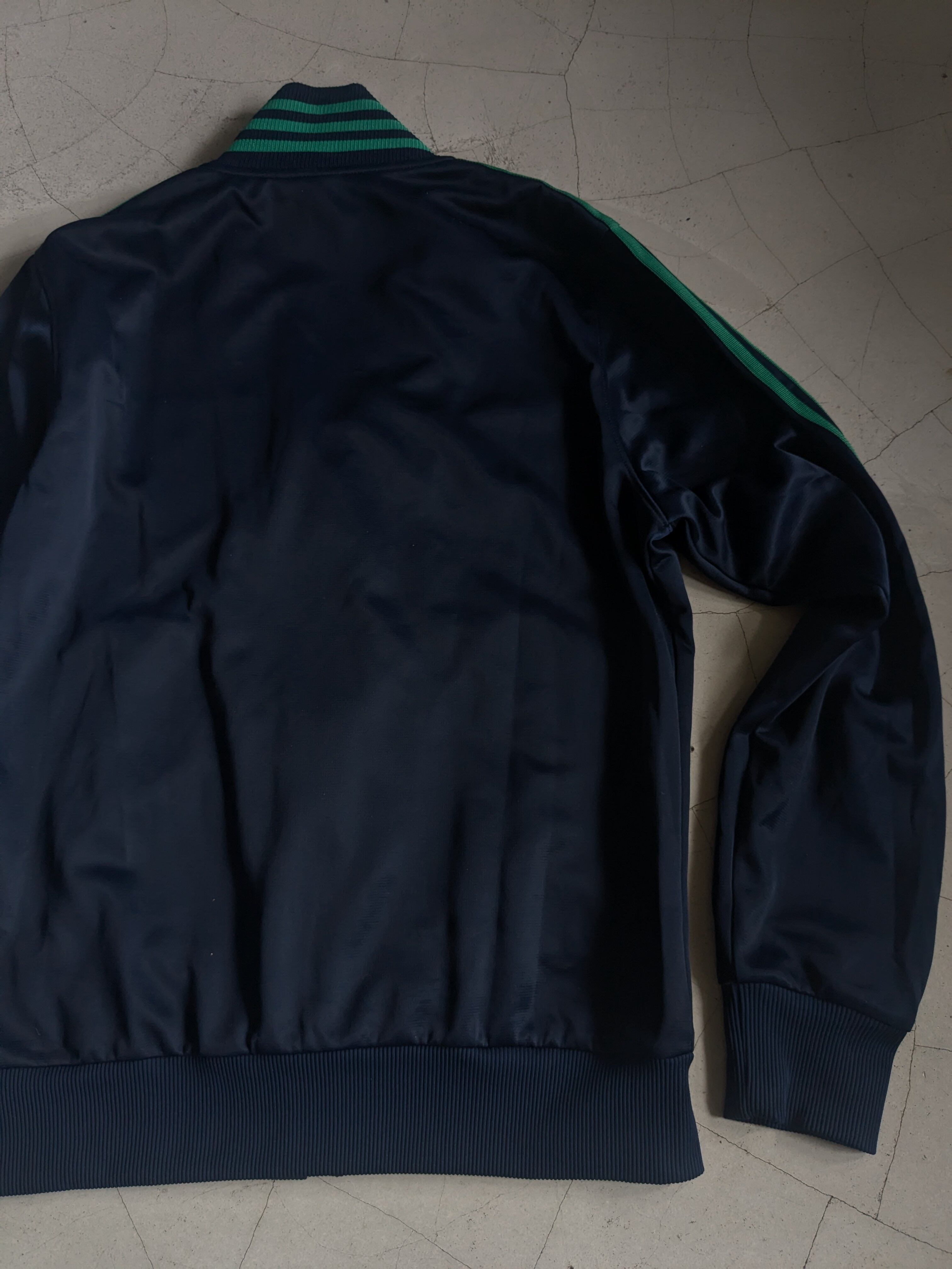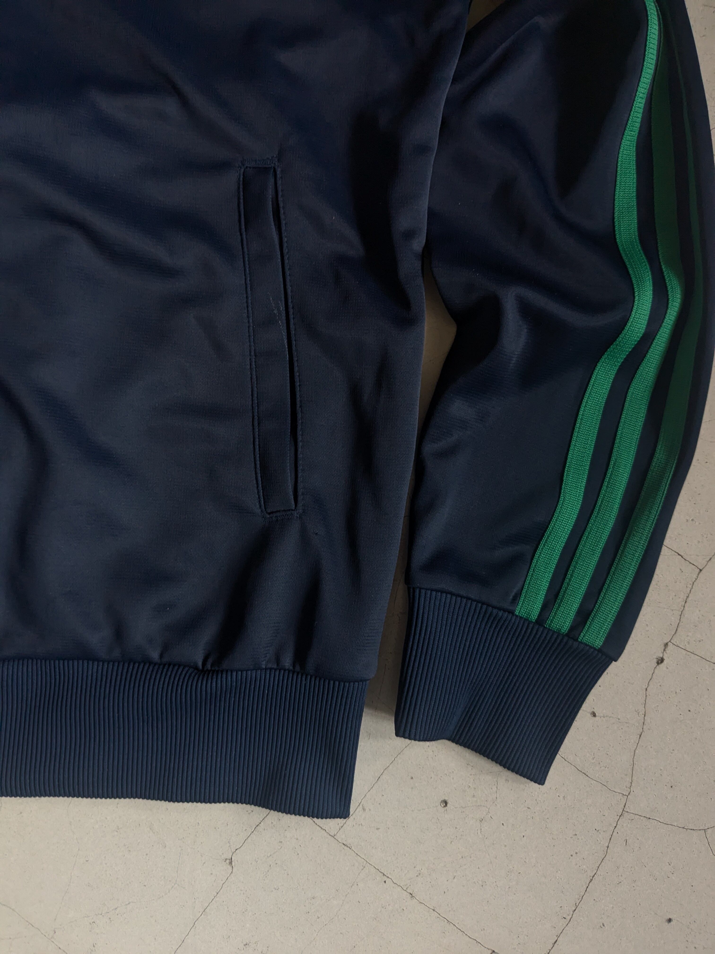 00s adidas 落ち着いたネイビーに鮮やかなグリーンラインが映えるトラックジャケット。 上品な配色なので、カジュアルになりすぎずまとまります。 生地:ポリエステル100% SIZE:(S) 肩幅 40cm 身幅 51cm 袖丈 62cm 着丈 62cm