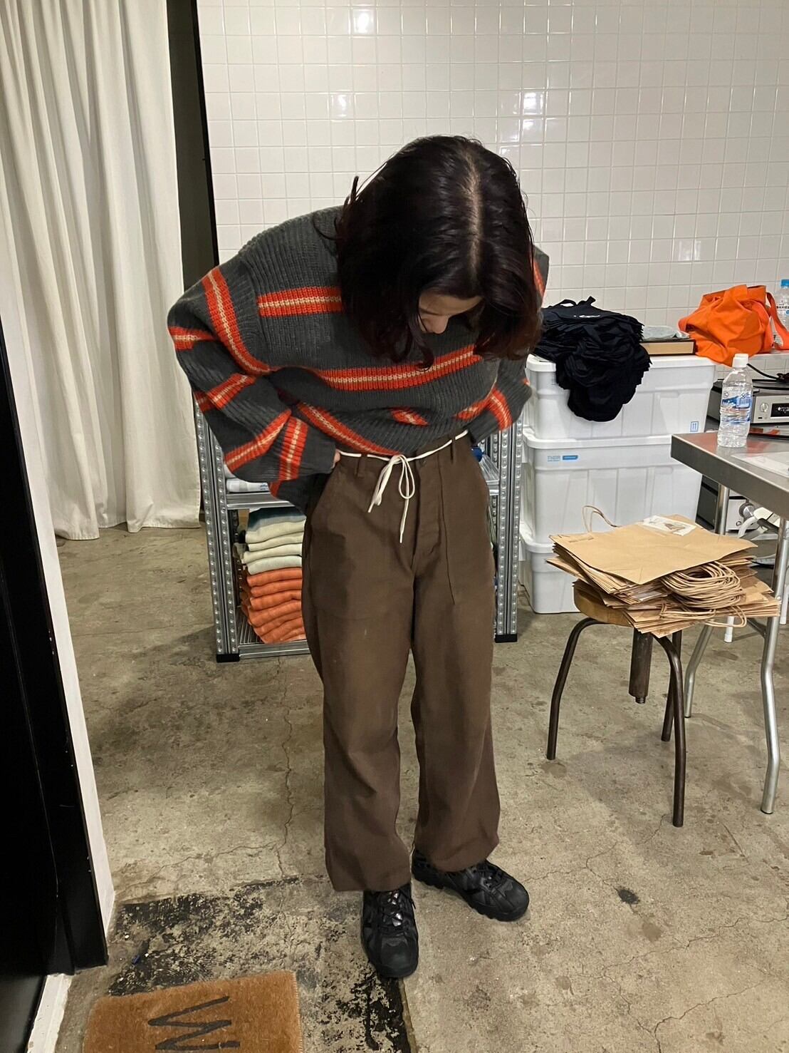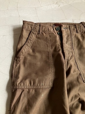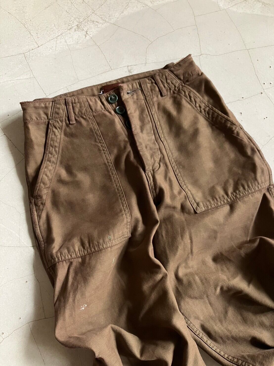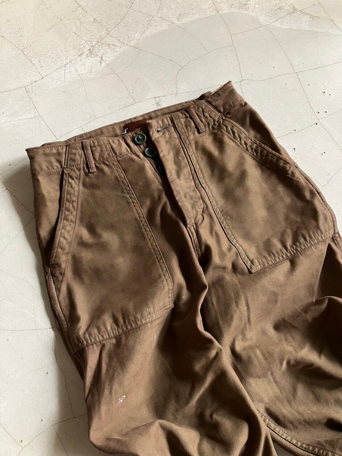クタクタのカーキのミリタリーパンツをブラウンの染料で染めたもの