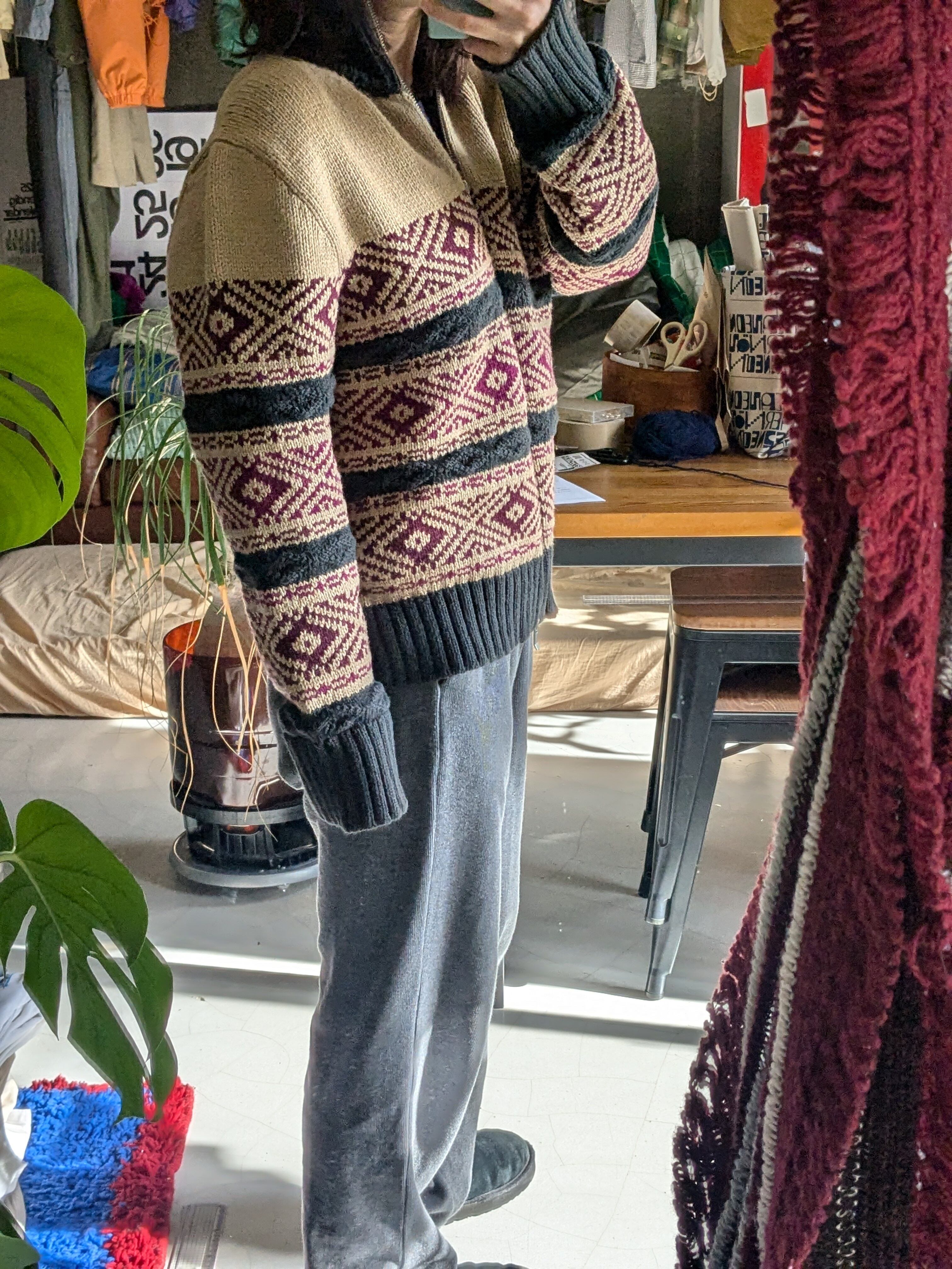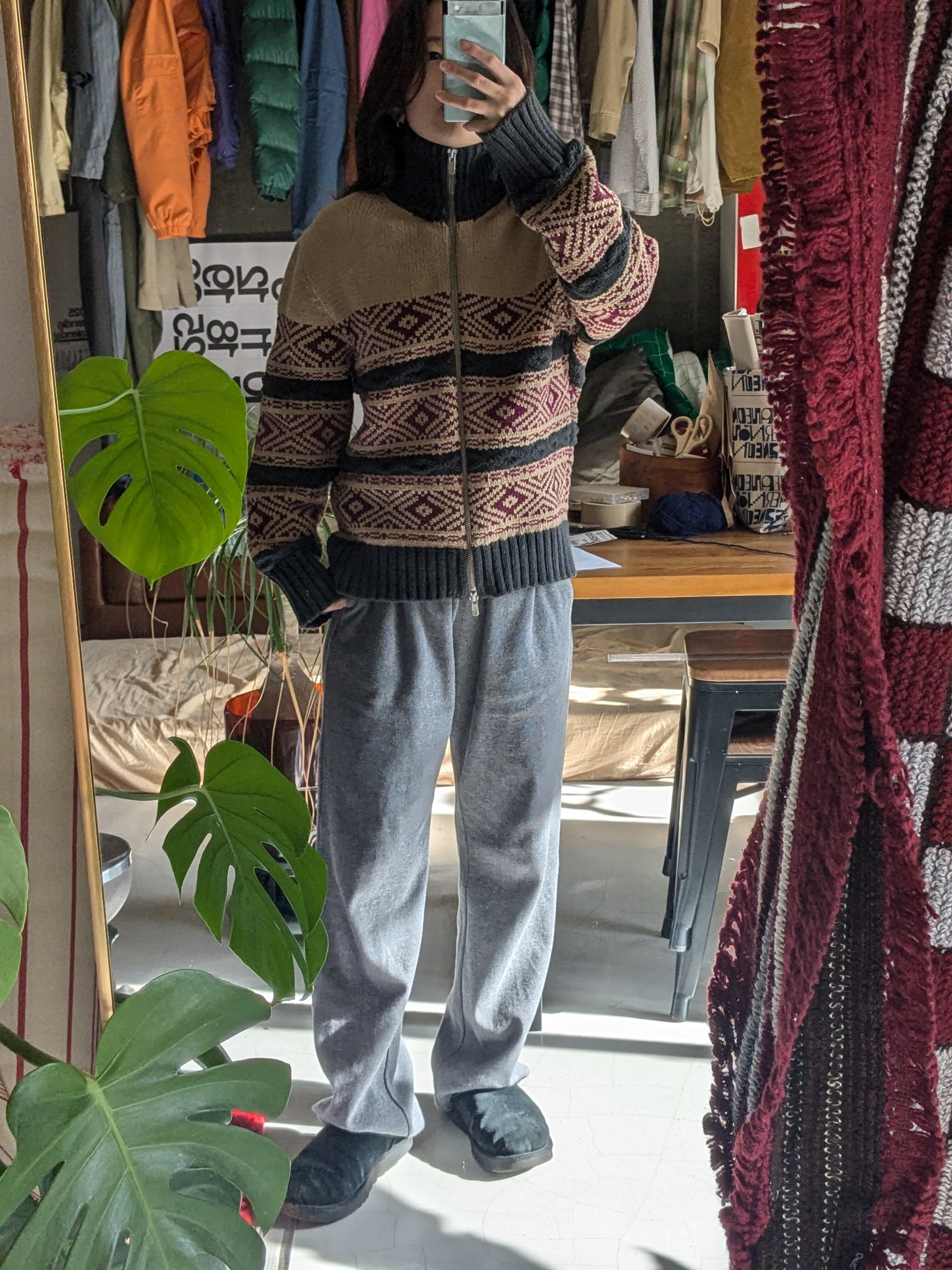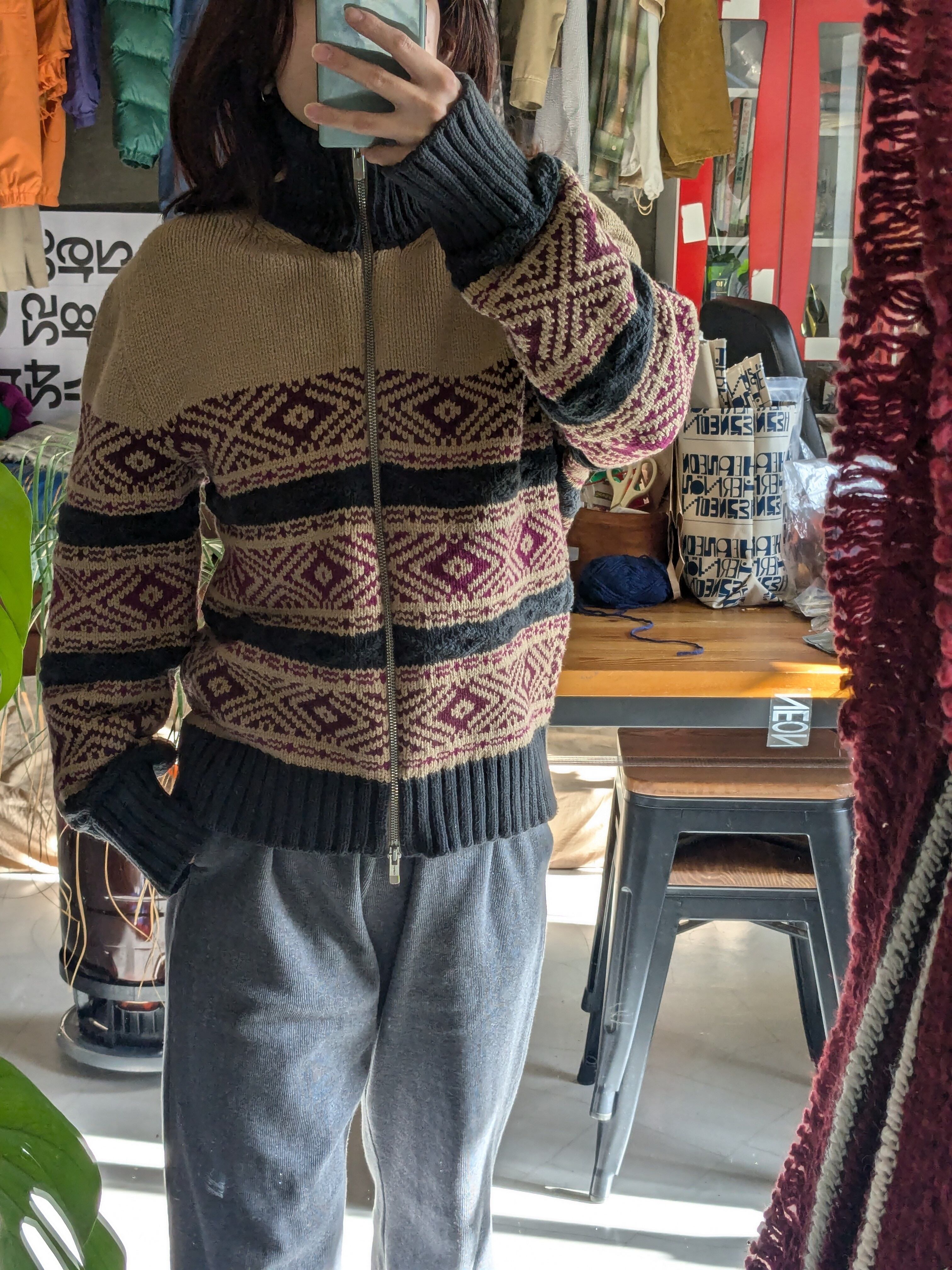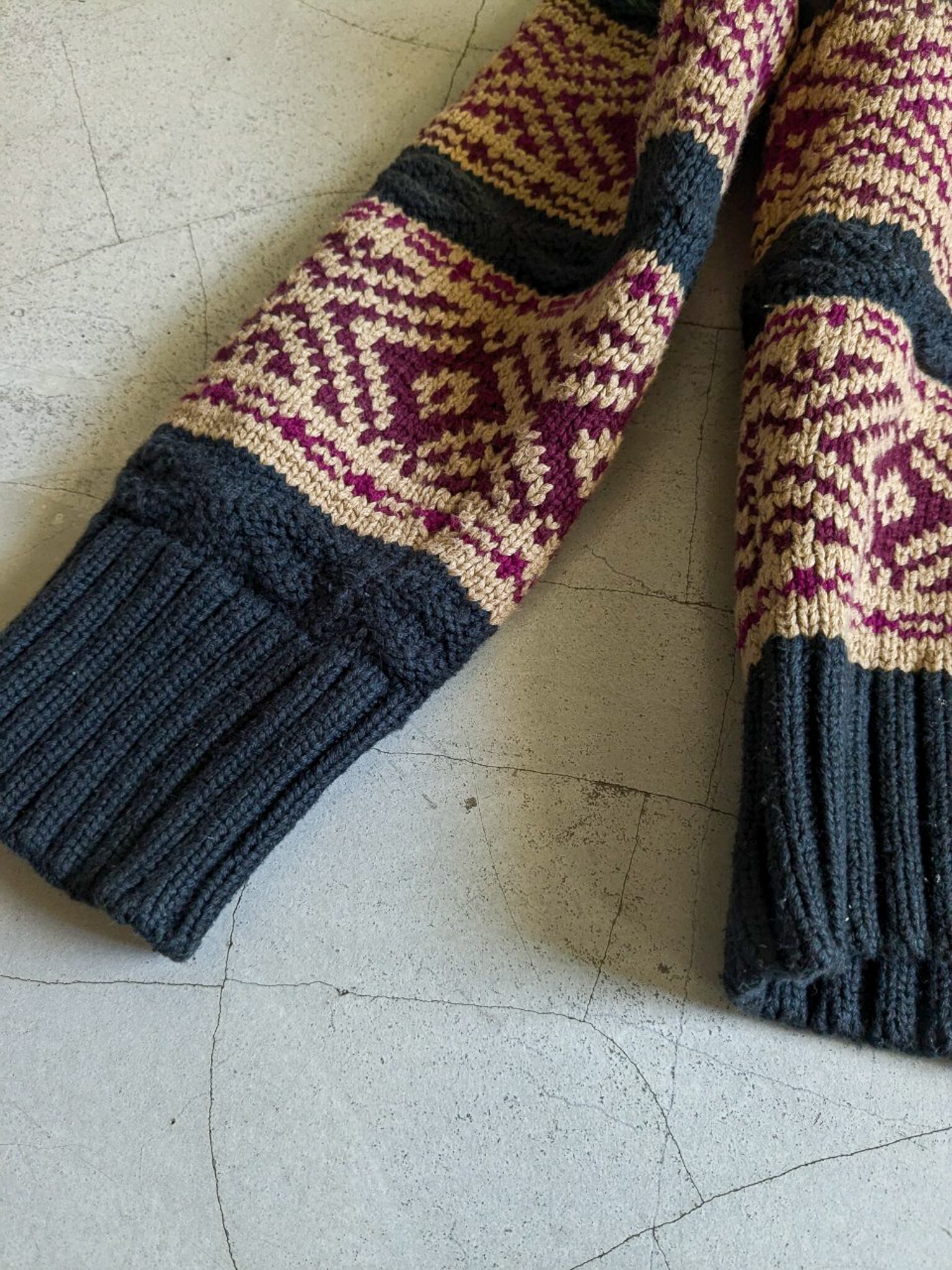 絶妙な配色、幾何科学な総柄、ローゲージの網目がなんともいえぬ表情を生み出してくれます
