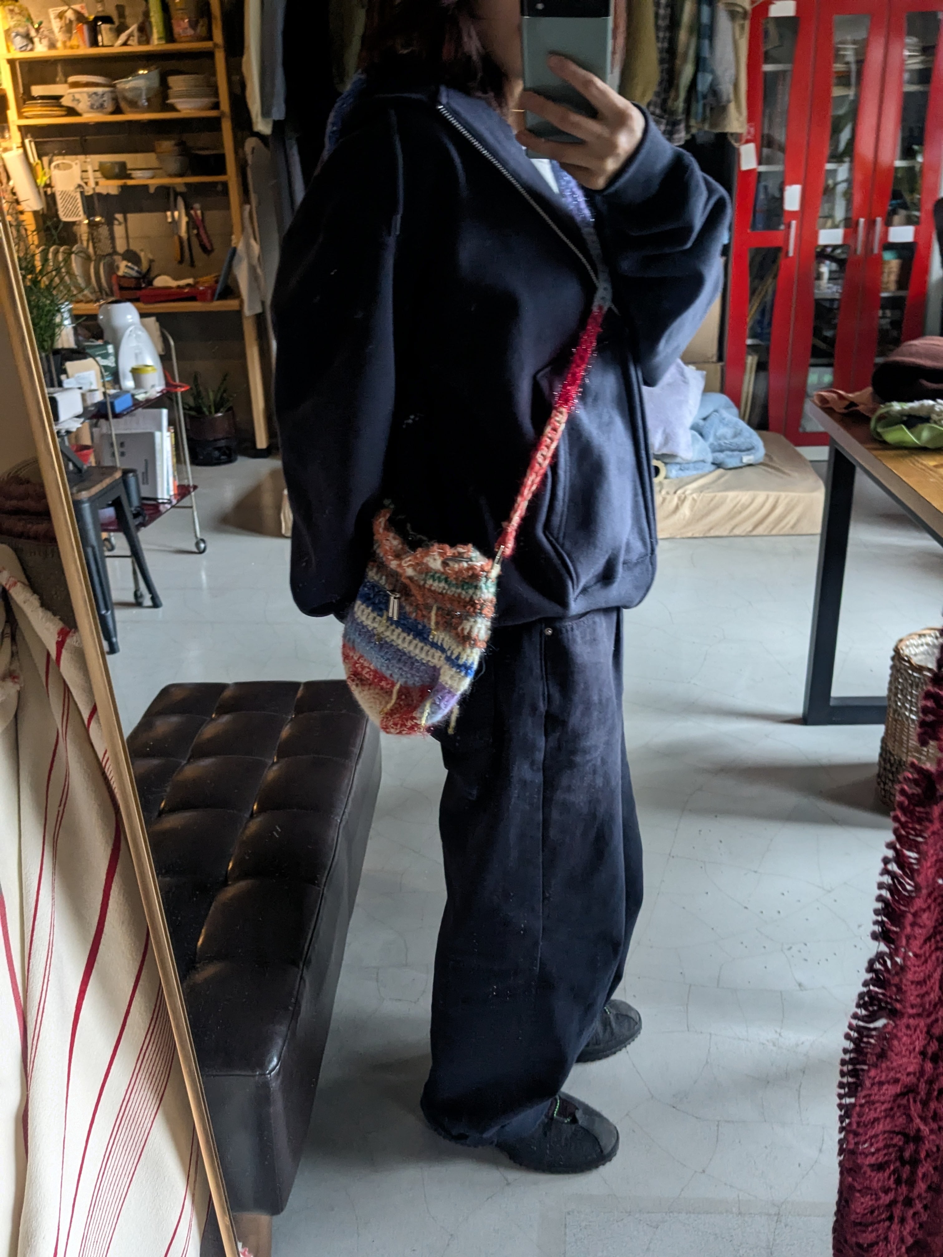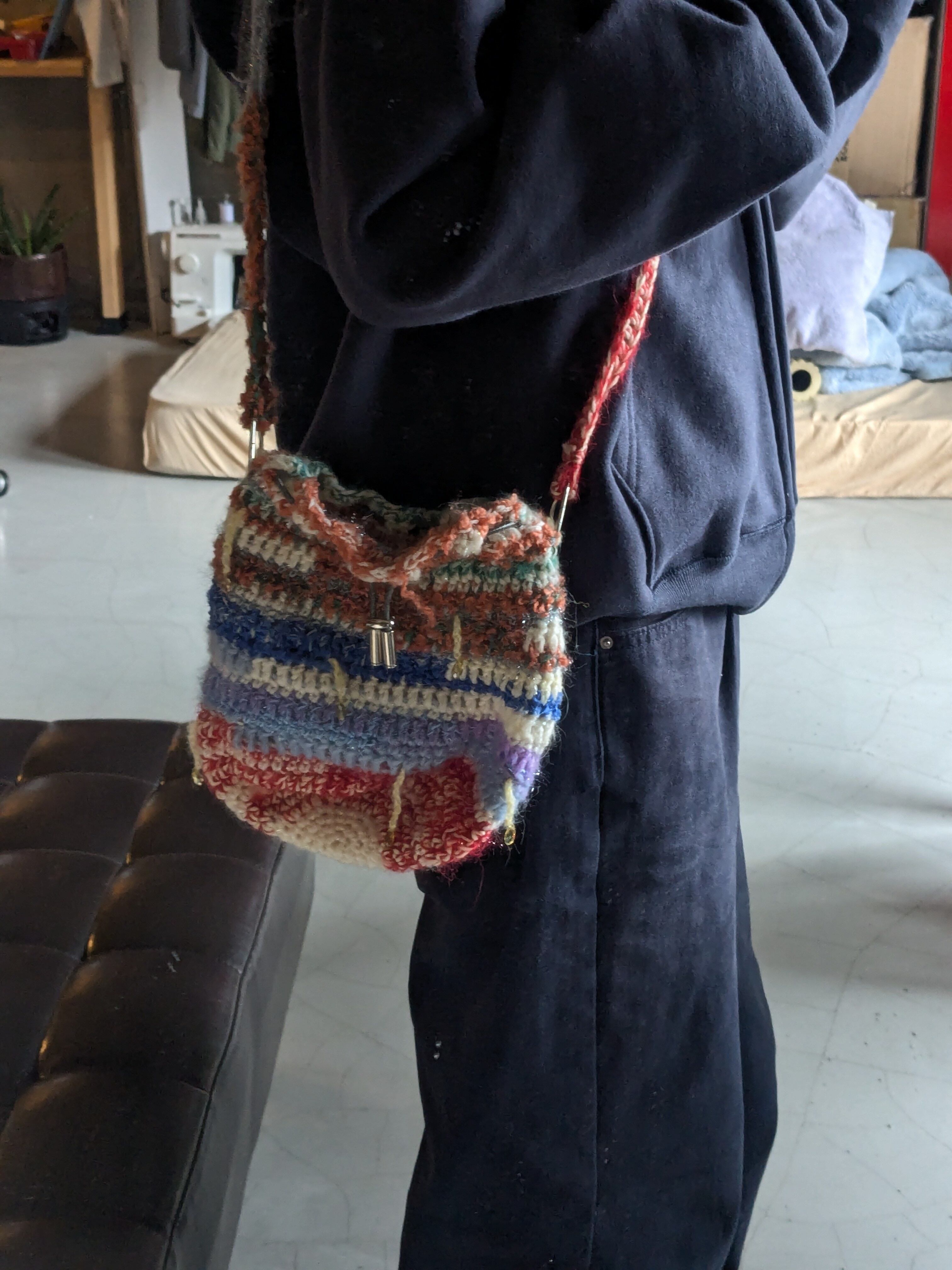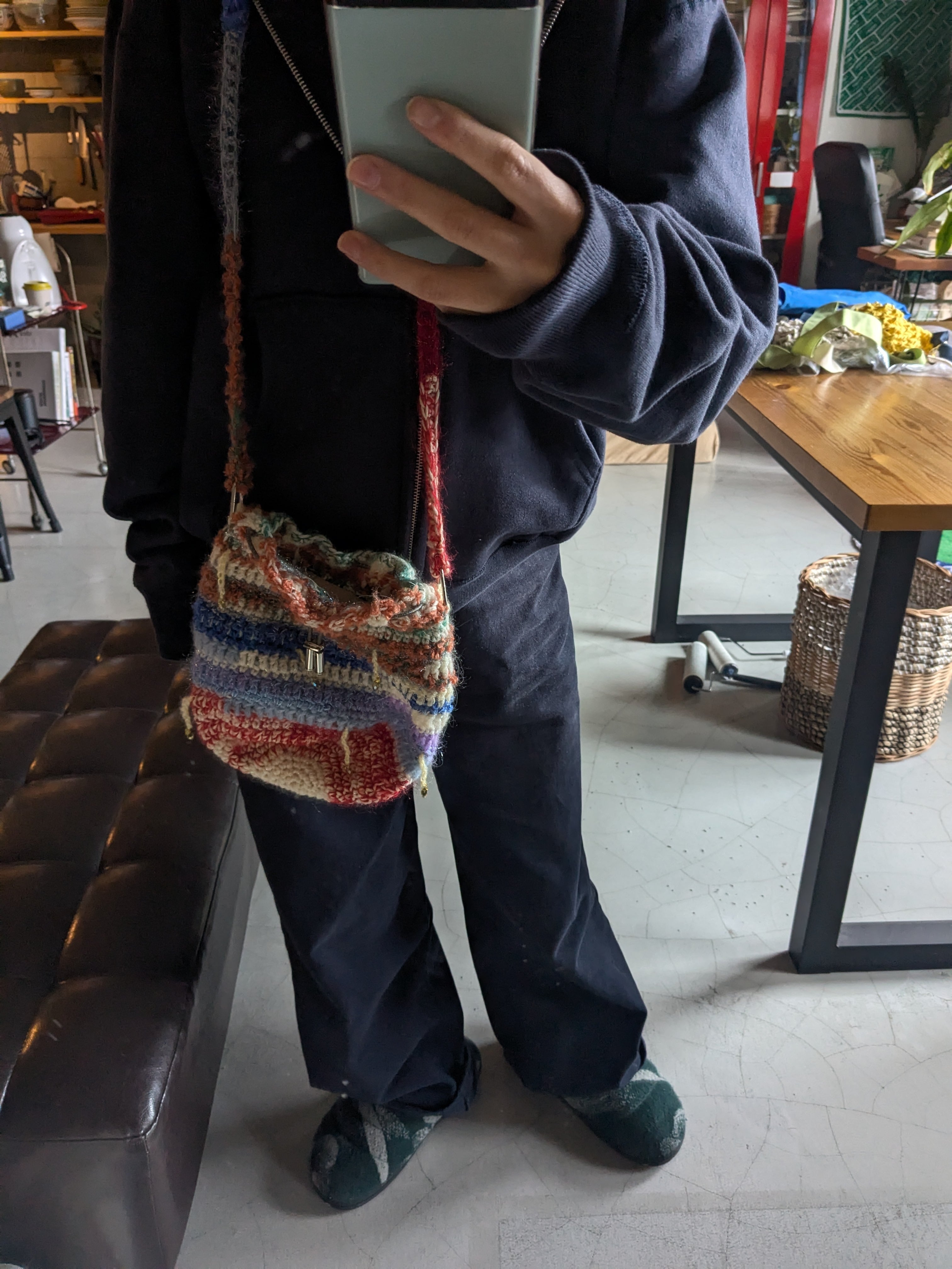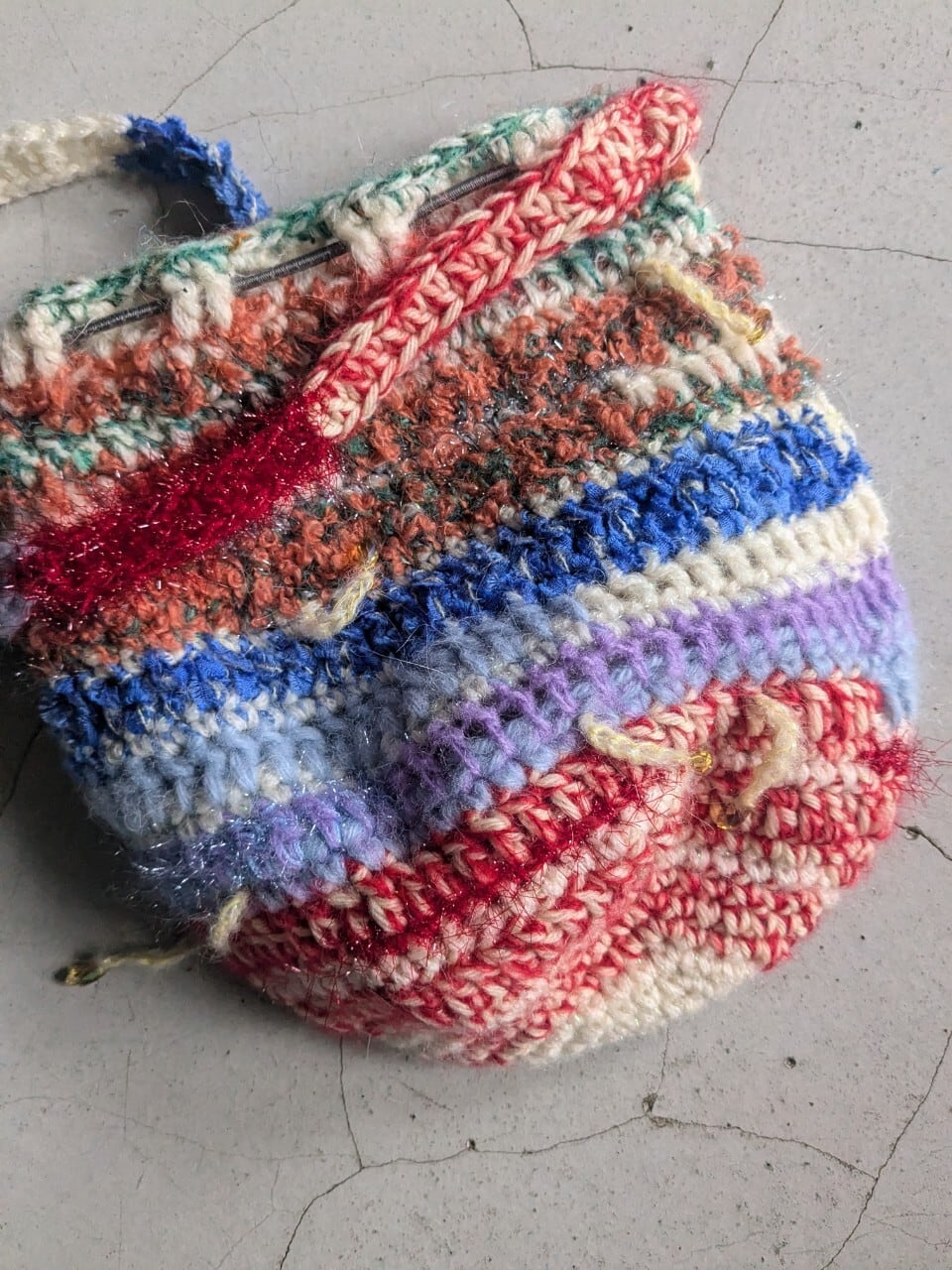 1点もののハンドメイドニットバッグです。 祐天寺のセレクトショップ404でも販売されています。 絶妙な配色に一目惚れして購入したのですが使用しないためどなたかに使っていただきたいです。 Hand-Made in USA Size 高さ:約17cm 幅 :約16cm ショルダー:約116cm ショルダー幅:約1.0cm