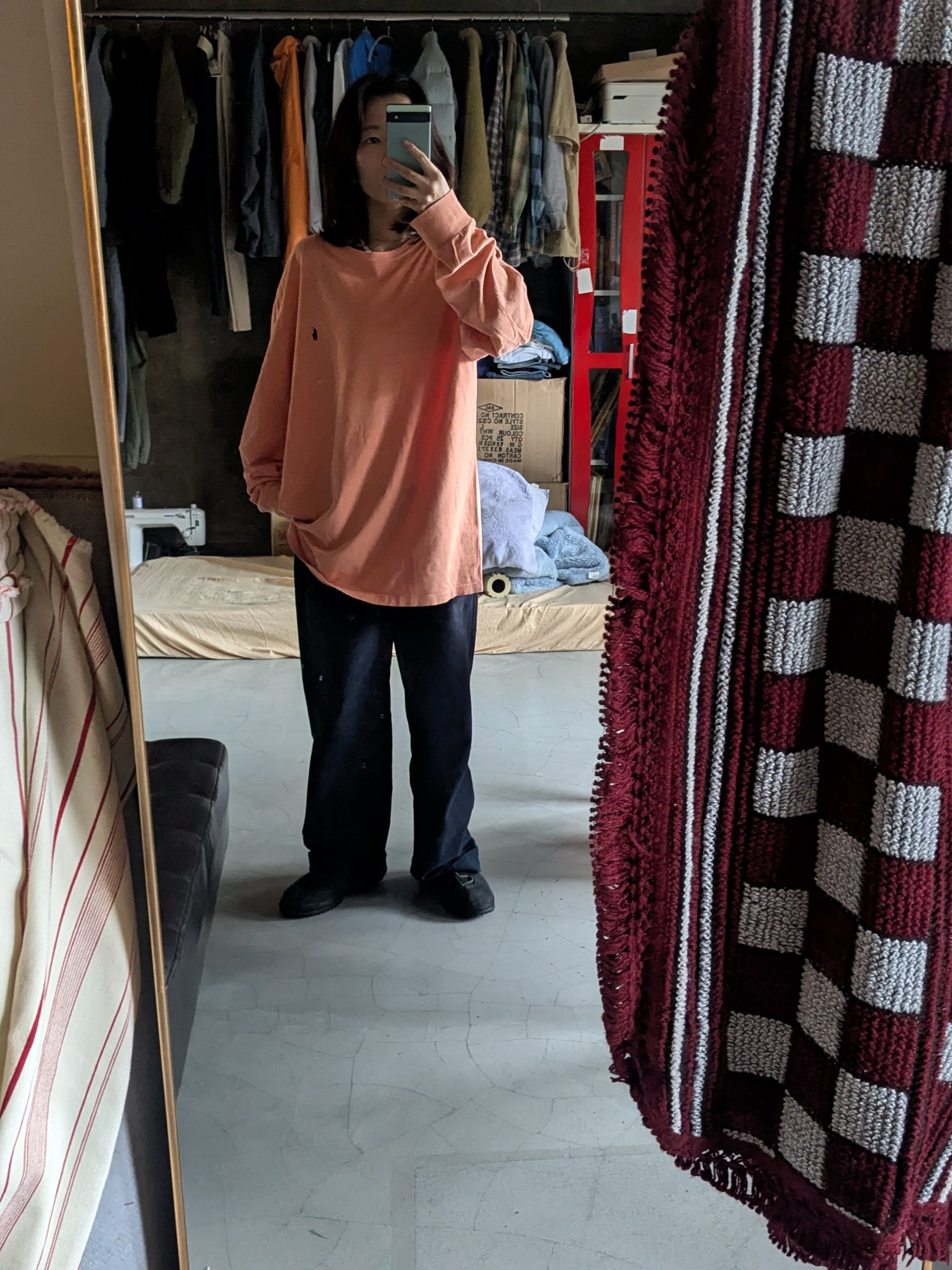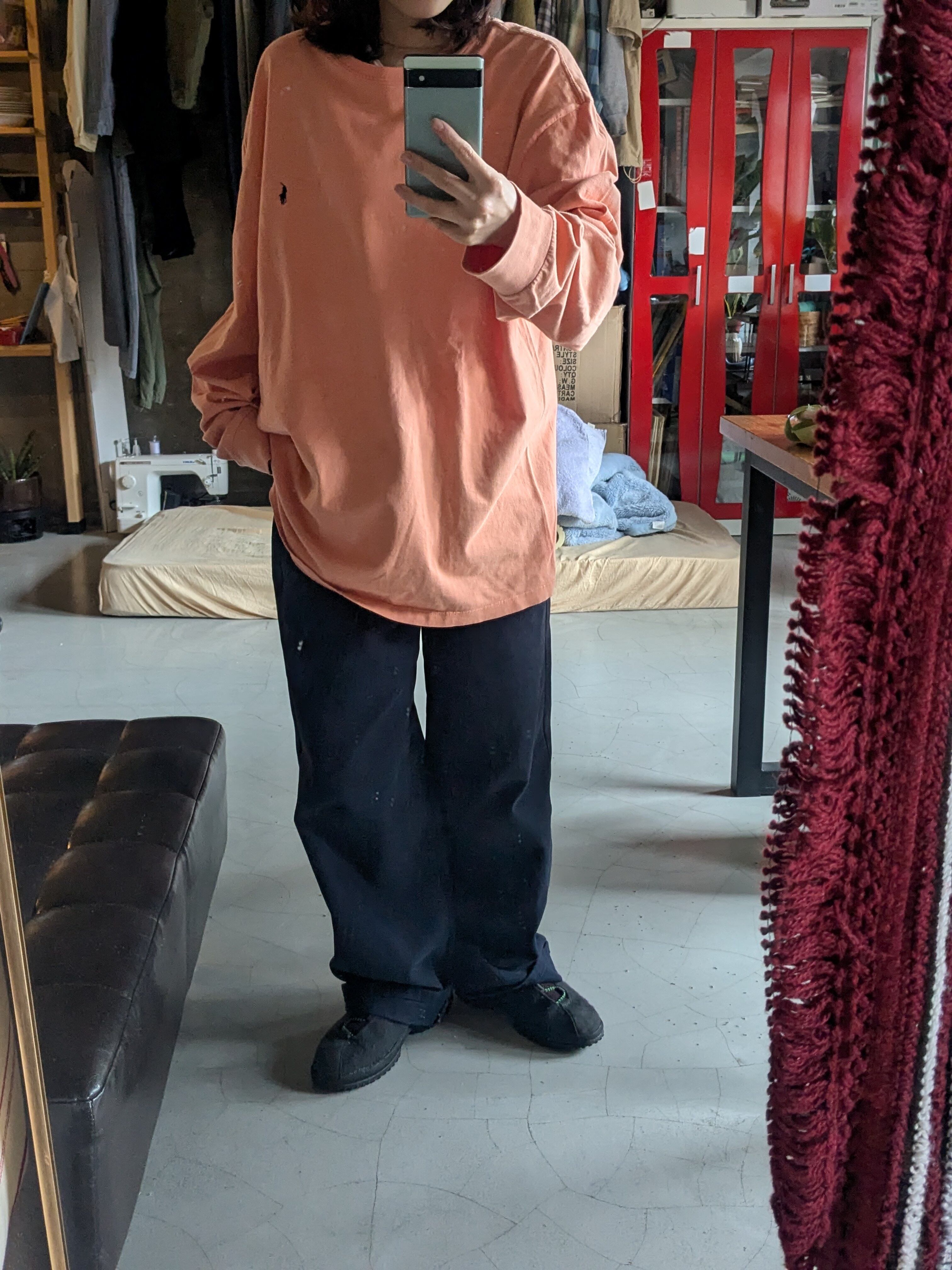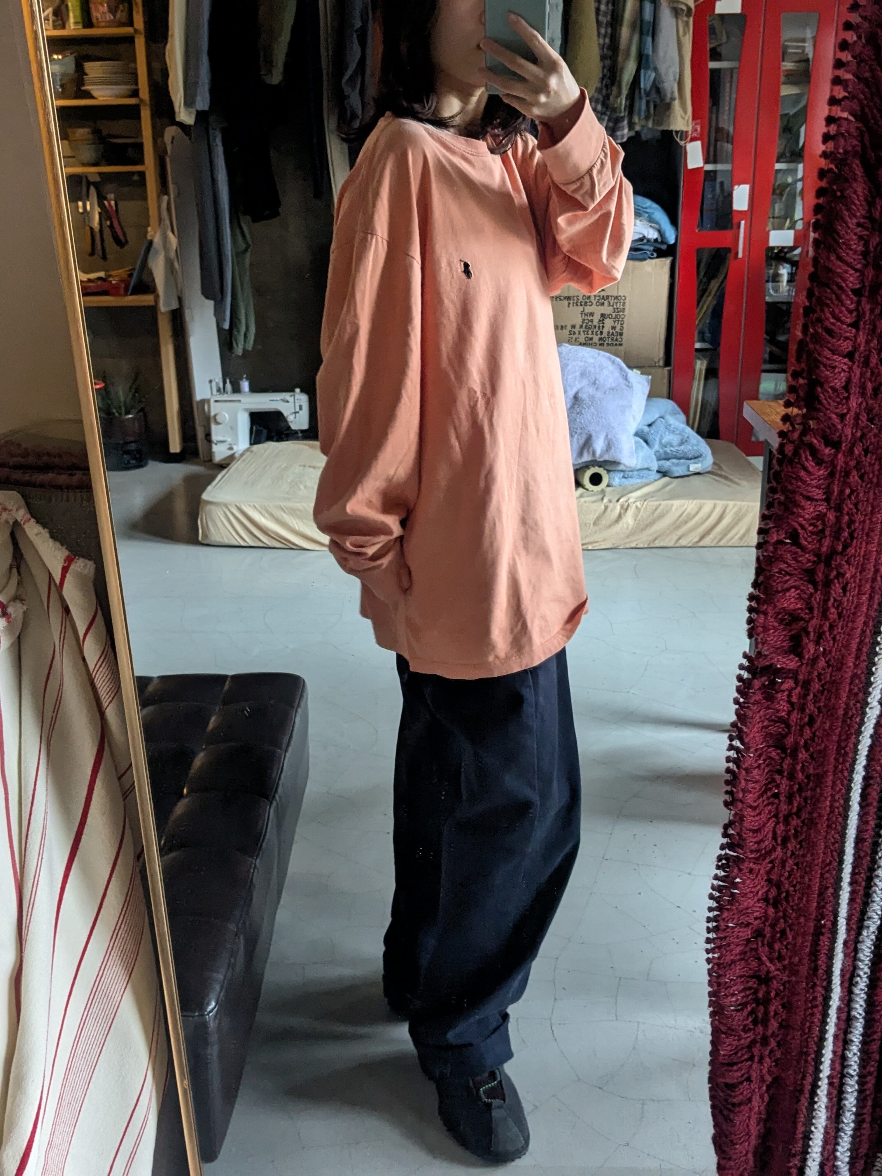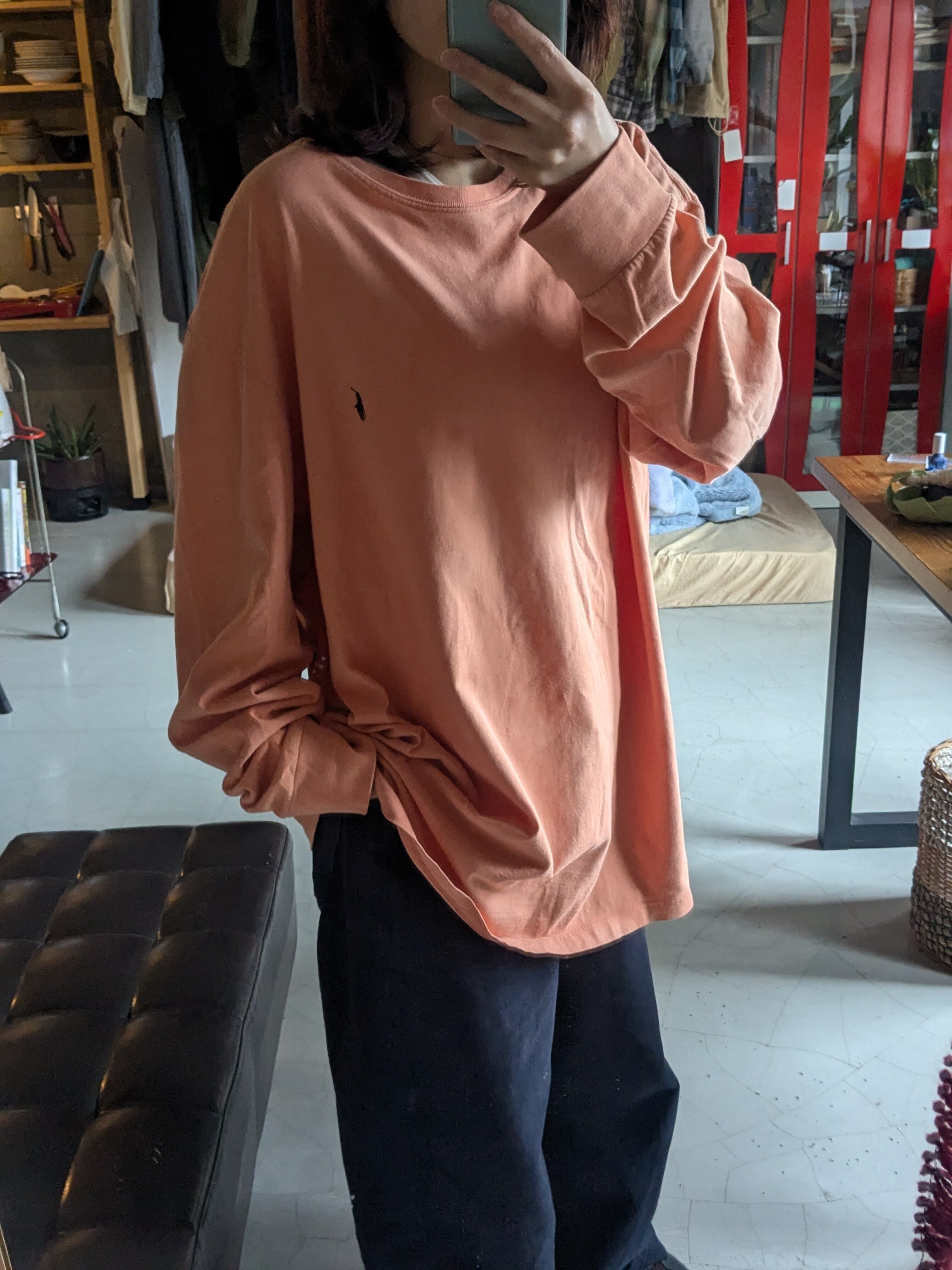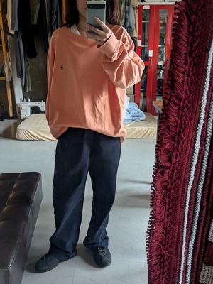 チノパンやデニム、すべて相性いいです。オーバーサイズに着るのがおすすめ